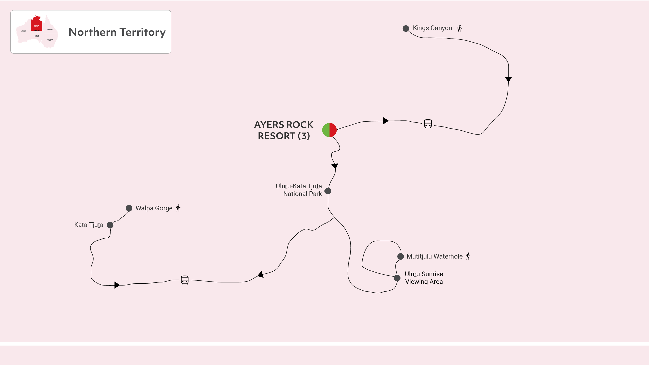 - Uluru-Kata Tjuta National Park Ticket Relax with sparkling wine and nibbles as you watch the sun set over Uluru the Red Centre's iconic landmark Uluru Barbecue Dinner Embark on a guided hike around the entire base of Uluru, covering approximately 12 kilometers (7.5 miles) Traverse the Kings Canyon Rim Walk to the Garden of Eden Enjoy tea & coffee at the Uluru Sunrise Viewing Area as you watch the sun illuminate the desert landscape Explore Kata Tjuta’s domes and Walpa Gorge Hotel Pick up and Drop Off Experienced Driver Guide Comprehensive commentary Travel in an air-conditioned coach