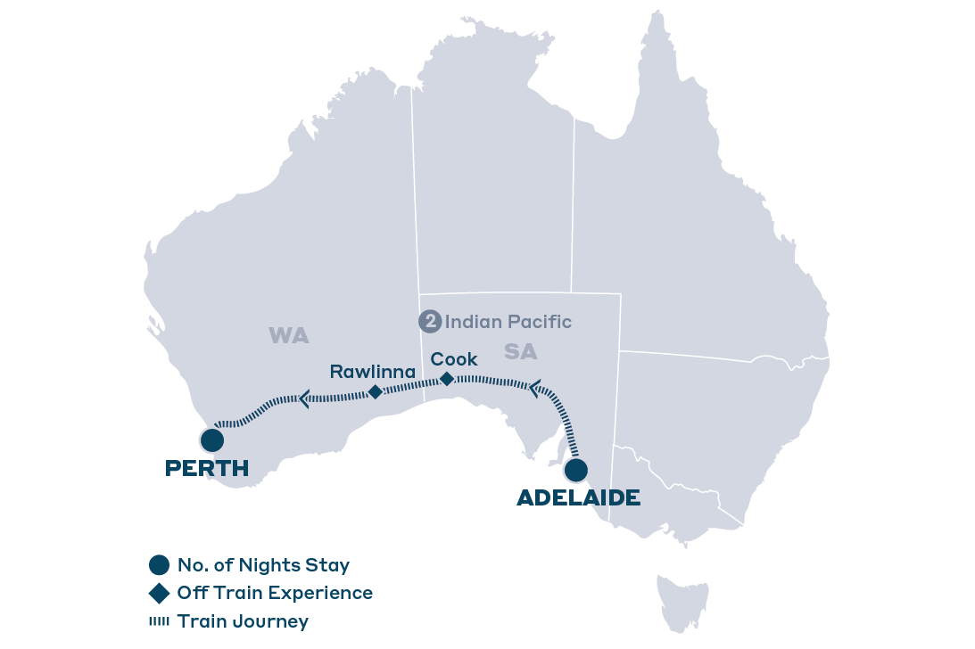 - 3 days / 2 nights aboard the Indian Pacific, travelling from Adelaide to Perth