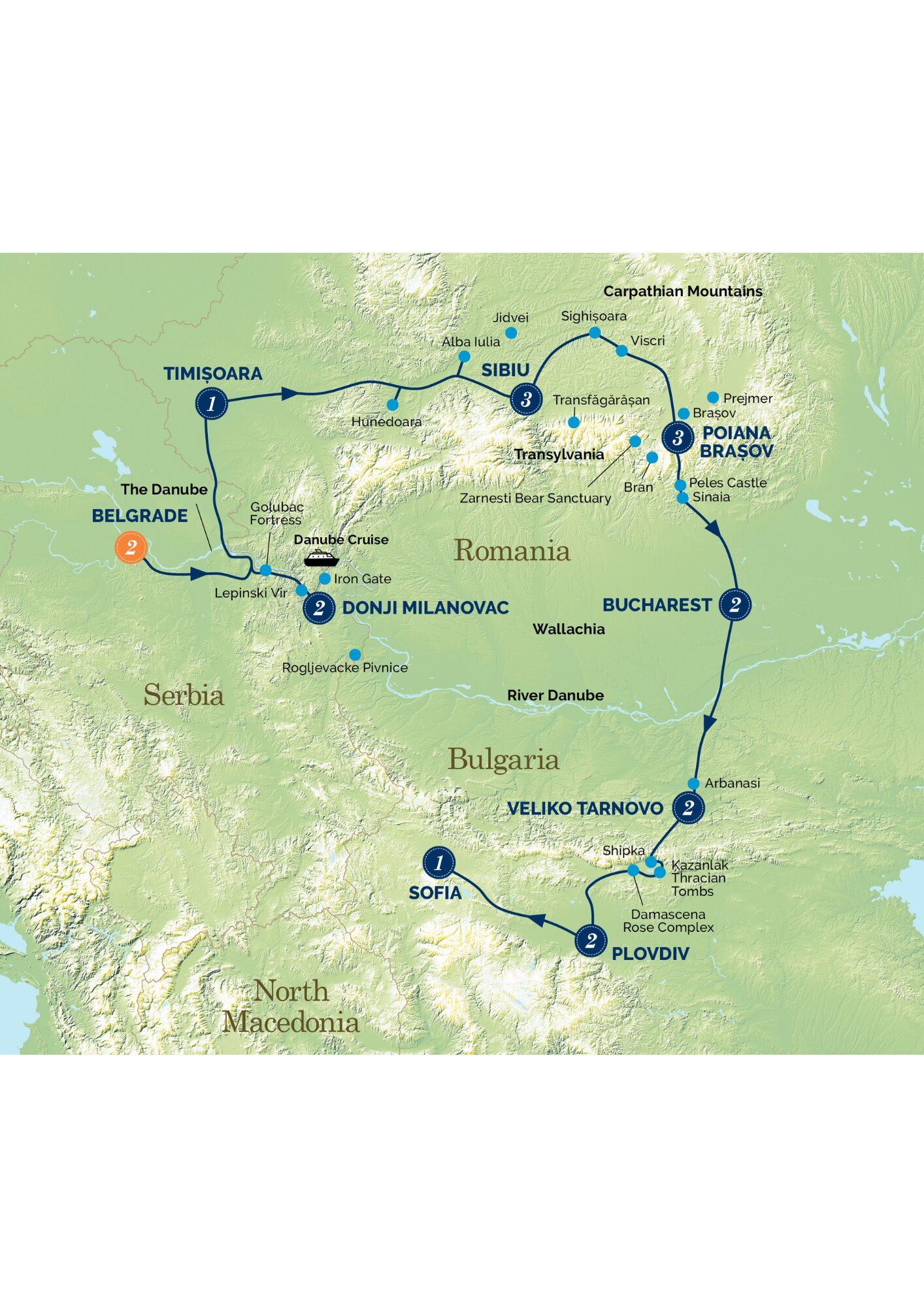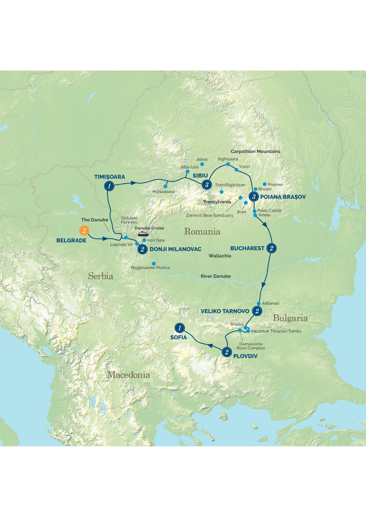 What a unique adventure! From Serbia’s vibrant capital of Belgrade, through to delightful Sofia in Bulgaria. In the middle? Romantic Romania, alluring Transylvania, the Carpathian Mountains and Wallachia. A land rich in history, culture and colour… a land where you will still be able to see horse and carts pulling giant piles of hay, where bears thrive in the deep forests, where UNESCO listed, perfectly preserved Saxon towns and villages litter the countryside, and where churches are fortified with giant walls to fend off attack. You will visit ancient castles like Golubac built to defend Europe’s biggest gorge, you will cruise through the Danube’s Iron Gates, see a monstrous kingly rock carving, take in Lepenski Vir – Europe’s oldest settlement, dine at dusk on a terrace overlooking the Danube and visit the strange, but oh so photogenic, Negotin Wine villages for lunch and a wine tasting! Three nights in Sibiu will entrance you, the hairpin bends of the stunning Transfăgărășan mountain road will enthuse you, the Libearty Bear Sanctuary will warm you, the perfect gem city of Sighișoara will stimulate you. In ancient Veliko Tarnovo we experience an amazing Sound and Light Show, at Bran we enjoy a private tour of ‘Dracula’s Castle’, we dine in a huge Transylvanian Forest igloo, and lunch in a Rose Distillery where the divine dessert cake is actually made with Rose petals! What an awesome tour, come join us!