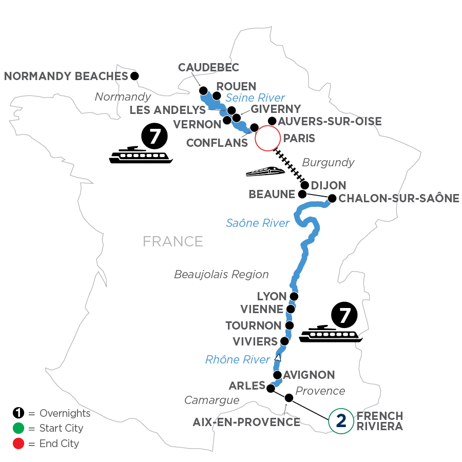 This incredible European river cruise highlighting the best of France is certainly grand! Begin your adventure on the French Riviera. Take in the beautiful countryside, quaint villages, and towns, as you sail through the most captivating views of France. Indulge in the legendary cuisine of France on this culinary focused cruise through Burgundy and Provence. With a Master of Wine on board and special culinary highlights throughout the Rhône portion of your cruise, you’ll sample regional French specialties with onboard cheese tasting, pastry demonstration, and with a unique dinner featuring a marvelous menu created just for you in the tradition of famous Chef Paul Bocuse.Embark your ship in Arles, France—famous for inspiring the paintings of Van Gogh—and its 1st-century Roman Amphitheater. On a guided tour of historical Avignon, see the 14th-century Palace of the Popes—the largest Gothic fortress in the world. Take a guided walk through the city of Tournon, beautifully nestled among vineyards and a medieval treasure of Roman ruins and a fascinating 16th-century castle. Visit Lyon, France’s gastronomic capital and a showcase of medieval and Renaissance architecture. On your Seine River cruise, you’ll have the choice of seeing the historic Normandy Landing Beaches, including Omaha Beach, the Pointe du Hoc monument, and the American Cemetery; the delightful Les Andelys, Joan of Arc’s Rouen, Vincent Van Gogh’s Auvers-sur-Oise, or Napoleon and Josephine’s Malmaison. On this French river cruise, you’ll enjoy wine, cheese, beautiful views, and stops in the most charming parts of France. Your vacation in France would not be complete without a stay in Paris—one of the world’s most romantic and vibrant cities! Discover its true heart on a guided walk through the sites of Paris’ rich history, or take a tour to see the iconic sites of this enchanting city. Walk in the footsteps of the great master artists, enjoy the delectable cuisine of France, and stand where heroes fought for freedom on the beaches of Normandy. This and so much more is waiting for you on your French cruise on the Seine!