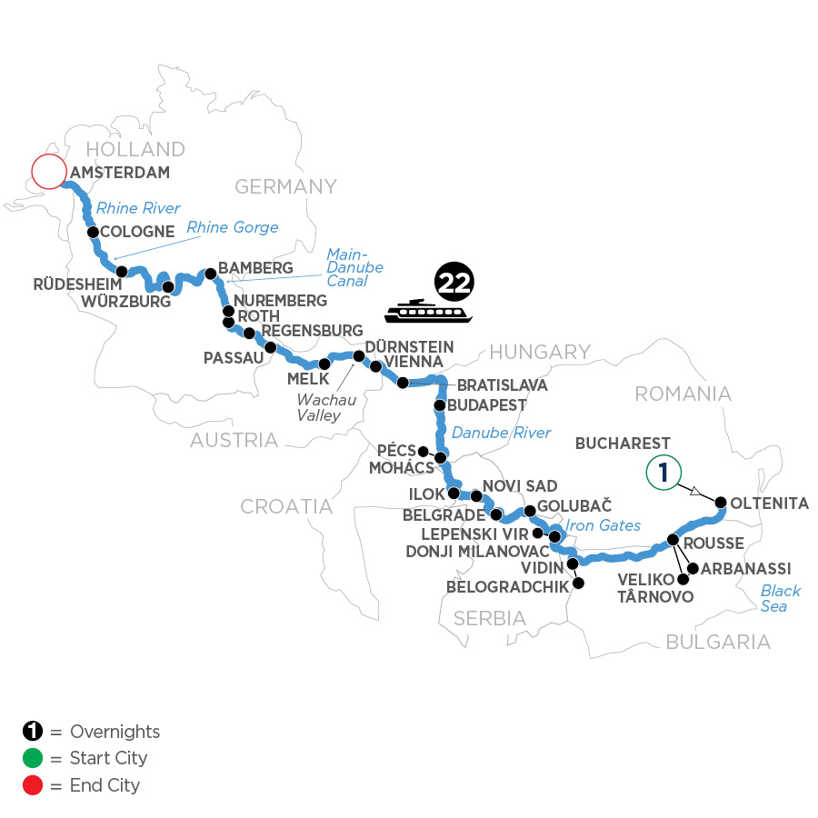 The City of Seven HillsCLASSIC Take a Guided Walking Tour of the former home to imperial dynasties, and see its Romanesque cathedral, Old Town Hall, and seven hills crowned with churches. DISCOVERY Attend an onboard lecture to learn about European history and culture.AFTERNOON/OVERNIGHT CRUISE TO WÜRZBURG (B,L,D)