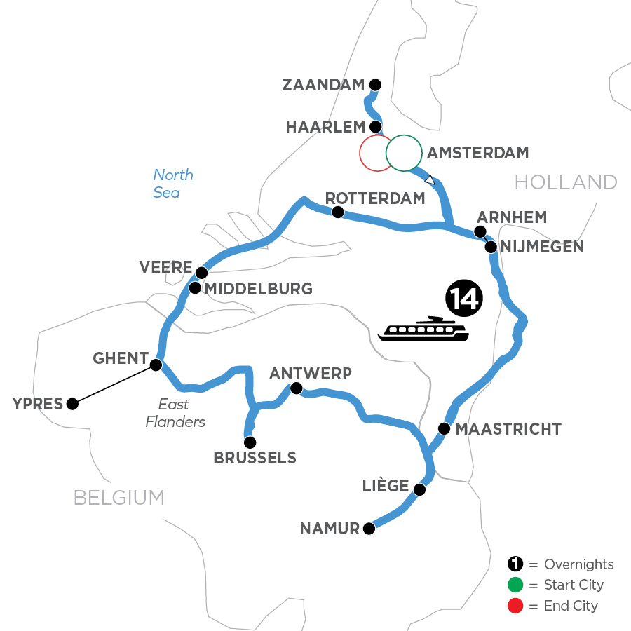 Begin your tulip season cruise in Amsterdam. Visit Nijmegen, the oldest city in the Netherlands. Choose a visit to Arnhem’s WWII Airborne Museum or a bike ride. In Maastricht tour the old cobblestoned university town. On to Belgium for a sightseeing tour of medieval Namur and free time to browse its ancient architecture, charming cafes, and bookshops. In Liège, see the ancient quarters of the “Fiery City” as well as its romantic streets, steps, and tiny alleyways. Next, you’ll explore the city of Antwerp—birthplace of the master painter Peter Paul Rubens. Stroll its cobbled lanes amid 16th-century guildhall houses and the cathedral’s stunning altarpiece paintings by the famous artist. In Brussels, you’ll find landmark buildings and a collection of cafes and shops on your guided tour. Visit “The Diamond of Flanders,” Ghent, for stunning Flemish artwork in St. Bavo’s Cathedral. Explore more of the Flanders area with In Flanders Fields Museum and moving battlefield memorials and memorabilia. In Middelburg, explore its grand history in the Dutch East India Company. Visit the fascinating Flood Museum to hear and see the stories of the flood of 1953. See the Erasmus Bridge in Rotterdam, and the quintessential Dutch towns of Zaandam and Haarlem with their signature flower farms, windmills, waterways, and North Sea trading. Your cruise through Holland and Belgium returns to Amsterdam for a guided canal cruise through the iconic city.