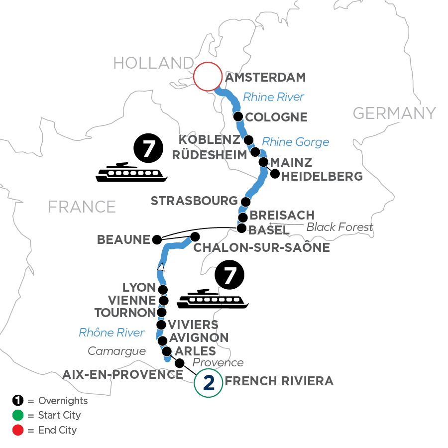 Immerse yourself in French and German culture on this fabulous European river cruise vacation along the Rhône and Rhine Rivers. Begin with two overnights on the French Riviera and relax along the remarkably blue water of the Mediterranean Sea. Take photos of the spectacular views that capture the romance and splendor of this magical journey. A Certified Sommelier will accompany you on your river cruise in France, Germany and Holland with presentations, tastings, and wine pairings along the way.Your French river cruise vacation begins in Arles—famous for inspiring the paintings of Van Gogh and its 1st-century Roman Amphitheater. On a guided tour of historical Avignon, see the 14th-century Palace of the Popes—the largest Gothic fortress in the world—and take a guided tour to Châteauneuf du Pape. The city of Tournon is beautifully nestled among vineyards, where you’ll take a guided walk in this medieval treasure with plenty of Roman ruins and a fascinating 16th-century castle. In Lyon, take a guided tour to Beaujolais and the following day to Chardonnay, where you will have the opportunity to taste local wines.Transfer from Chalon-sur-Saône to embark on your Rhine River cruise from Basel, Switzerland. In Breisach, enjoy an excursion to Germany’s Black Forest or take an excursion to the charming village of Colmar, followed by a visit to a chateau wine cellar. In Strasbourg, France, stroll through the picturesque La Petite France district. Visit the ruins of Heidelberg’s castle or stop in Speyer for a guided walk and a visit to the Wine Museum. Sail to the charming wine town of Rüdesheim, with a visit to the unique Siegfried’s Mechanical Musical Instrument Museum. Alternatively, enjoy a visit to Eberbach monastery and its wine cellar. Sail through the dramatic Rhine Gorge, the most beautiful view of the Rhine River where ancient castles stand on cliffs 400 feet above the water. Your last stop in Germany is Cologne, where a guided walk shows you the highlights of this 2,000-year-old city. A stay in Holland’s popular, modern capital of Amsterdam is the perfect way to conclude this sensational European river cruise. And the best way to see the treasures of this 700-year-old city is on a canal cruise along the elegant Grachten lined with homes dating back to the city’s “Golden Age."About Certified SommeliersSeldom do travelers get the chance to learn about wines from certified experts in the field! Avalon invites you to sail in the company of a certified sommelier who shares elite experience, unsurpassed knowledge, and personal passion for wines on board your ship. We are honored to offer our guests the expertise of certified sommeliers who join select cruises to share their insights and inspiration in all things wine. Truly exclusive experiences for wine lovers!