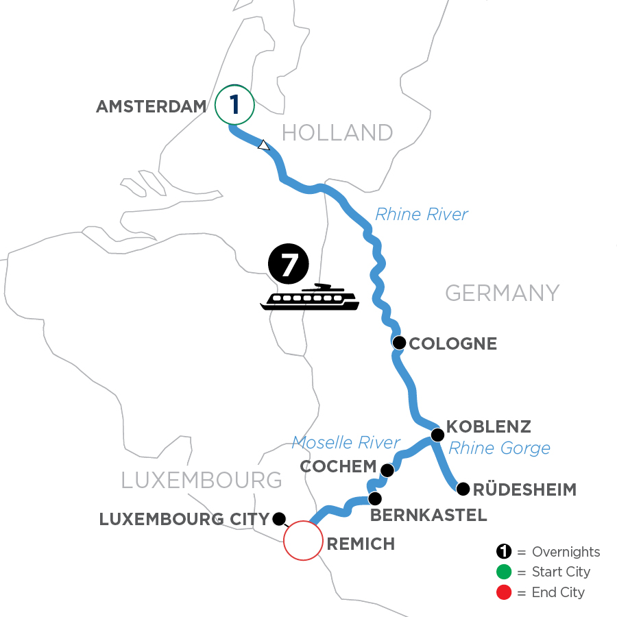 This magnificent European river cruise vacation starts in Holland’s colorful, modern capital of Amsterdam. Begin your vacation your way with a one-night stay in this beautiful city! Join us for an off-the-beaten-path guided walking tour through its cobblestone streets before embarking on your Suite Ship®. Next day, continue to explore this 700-year-old city from a unique perspective on a canal cruise along the elegant grachten. Then, sail along the Rhine River to Cologne, Germany—a 2,000-year-old city known for its Gothic-style architecture. On a guided city walk, see the famous twin-spired cathedral and explore the cobblestone streets of the Old City. You’ll sail through the dramatic Rhine Gorge—the most beautiful stretch of the Rhine River where ancient castles stand on cliffs 400 feet above the water. In the charming wine town of Rüdesheim, enjoy a stroll through its famous cobblestone Drosselgasse lined with shops, restaurants, and lively taverns. Along the Moselle River, stop at the picturesque town of Cochem where the Riesling grape is cultivated. Visit Reichsburg Castle, nestled among vineyards and offering breathtaking views of the town and river valley below. In Bernkastel, enjoy a guided walk and taste some of the region’s best-loved wines. Go on an excursion to historical Luxembourg City, offering unique and dramatic views as it is set on two levels—high above on straddling hills and dropping into two river valleys.