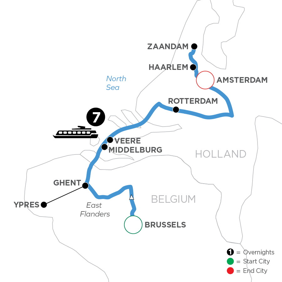 Discover the treasures of Belgium and Holland while cruising from Brussels to Amsterdam. Take in the quintessential Dutch scenes of windmills, waterways, and seemingly endless rows of blooming color. Embark in Brussels and sail to Ghent— “The Diamond of Flanders.” Visit St. Bavo’s Cathedral with its stunning Flemish artwork. For moving battlefield remembrances, visit In Flanders Fields Museum and take part to the Last Post Ceremony. On to Holland for a visit the former Dutch East India Company trading port and marvel at the Erasmus Bridge in the historic port city of Rotterdam. Take in the tulips and other flowering bulbs in the flower farm regions of Zaandam and Haarlem, and conclude your river cruise through Belgium and Holland with a visit to Amsterdam. Take a guided canal cruise past bridges and homes of a golden age.