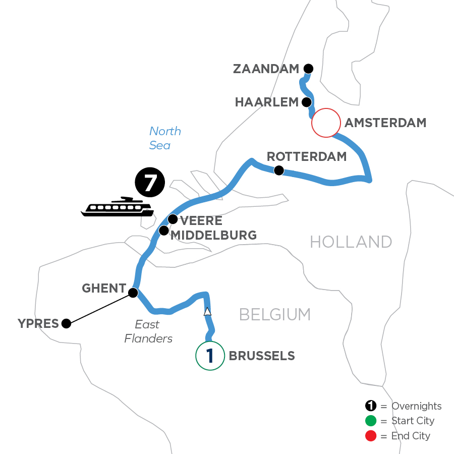 Discover the treasures of Belgium and Holland. Begin your vacation your way with a night in Brussels before your cruise. Enjoy superior hotel accommodations with complimentary breakfast, sightseeing with an expert Local Guide, and courtesy hotel-to-ship transfer. You’ll join a guided tour to see the landmark buildings and inviting venues before embarking on your river cruise from Brussels to Amsterdam. Delight in quintessential scenes of windmills, waterways, and rows of blooming color along the way. Embark in Brussels and sail to Ghent “The Diamond of Flanders.” Visit St. Bavo’s Cathedral with its stunning Flemish artwork. For moving battlefield remembrances, visit In Flanders Fields Museum and take part to the Last Post Ceremony. On to Holland for a visit to the former Dutch East India Company trading port of Middelburg and in Rotterdam the Erasmus Bridge. You’ll see why windmills are a symbol of Holland! Take in the tulips and other flowering bulbs in the flower farm regions of Zaandam and Haarlem and conclude your river cruise through Belgium and Holland with a visit to Amsterdam. Take a guided canal cruise past bridges and homes of a golden age.