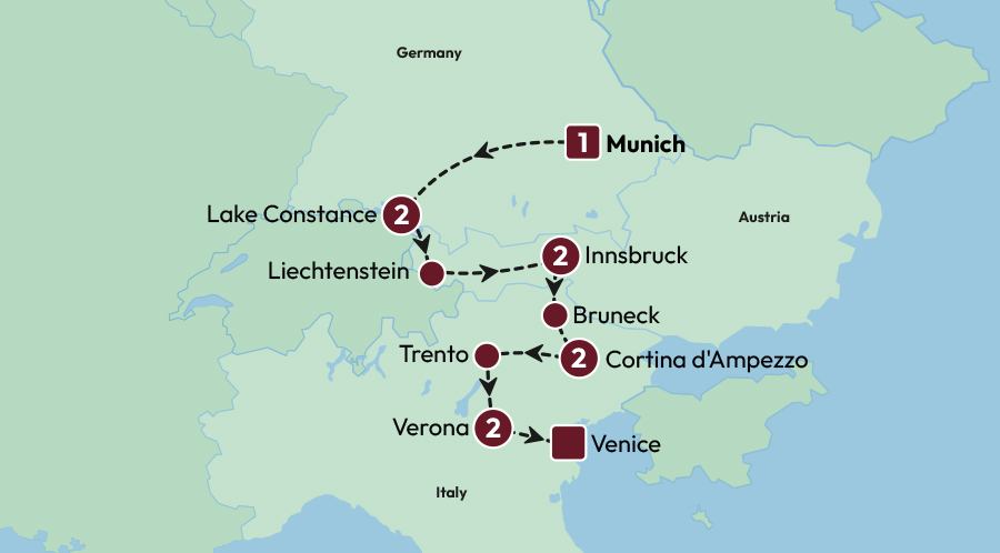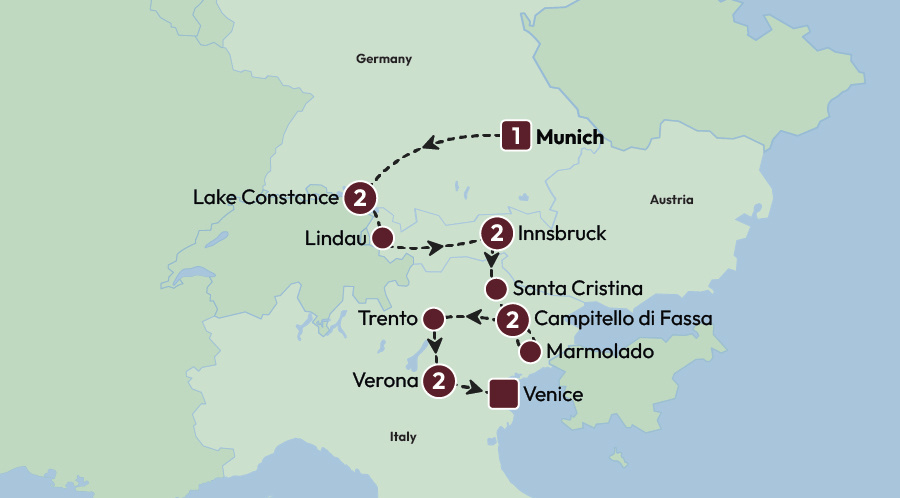 When was the last time you filled your lungs with crisp mountain air, indulged in a glass of locally-produced wine (or two) and ambled through knots of colourful streets? Well, now’s your chance to write your next travel tale. Get ready to be inspired by the towering Dolomites whose jagged peaks graze the sky like giant hands reaching up from the earth. Uncover the romance of Verona with its infamous balcony that tells a story of love and loss. And pause at Lake Constance, whose water glistens like millions of turquoise gemstones. This enchanting trio of countries is waiting for you.
