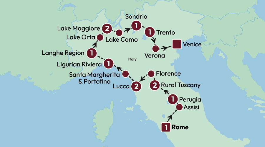 Have you ever met a white peacock, or found a truffle deep beneath the ground? This indulgent Italian adventure reveals a new discovery with every twist and turn. Ignite your imagination as blissful lakes invite you to linger, a sea of vines presents a silky Chianti wine, and terracotta towns dance with Renaissance tales. It's time to slow down and soak it all up – the journey won’t last forever, but the memories certainly will.
