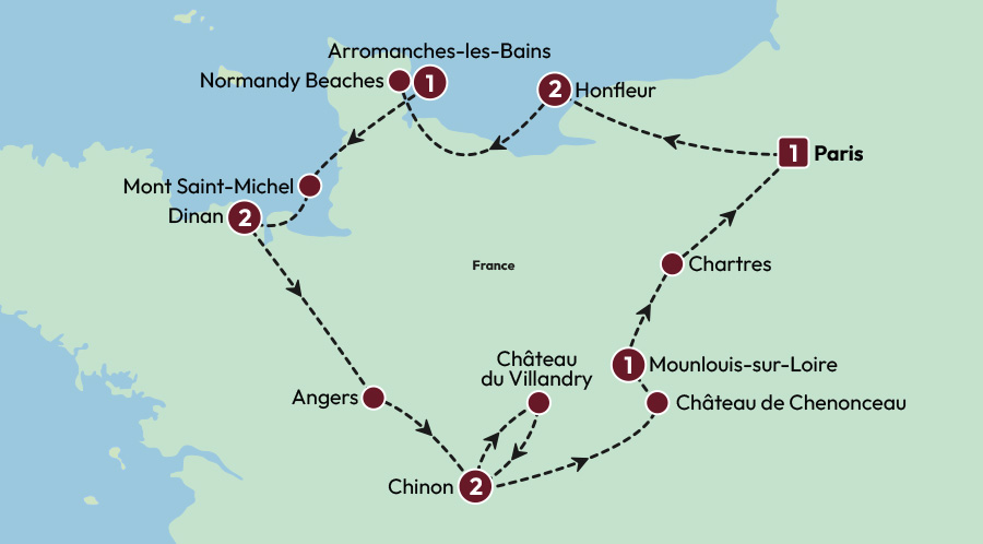 Dive into a land of renowned artists and royal crusaders, hilltop monasteries and valley castles – this 10-day journey takes us from France’s dramatic northern shores to its château-sprinkled countryside. Along the way, indulge in fresh seafood and revel in the delights of the Loire’s vineyards. You’ll meander through elegant villages rich with stories of epic battles, curious myths and mighty legends, and pause for a moment of reflection at Normandy’s beaches, where tales of war endure. France’s timeless beauty and captivating history awaits – what memories will you create?