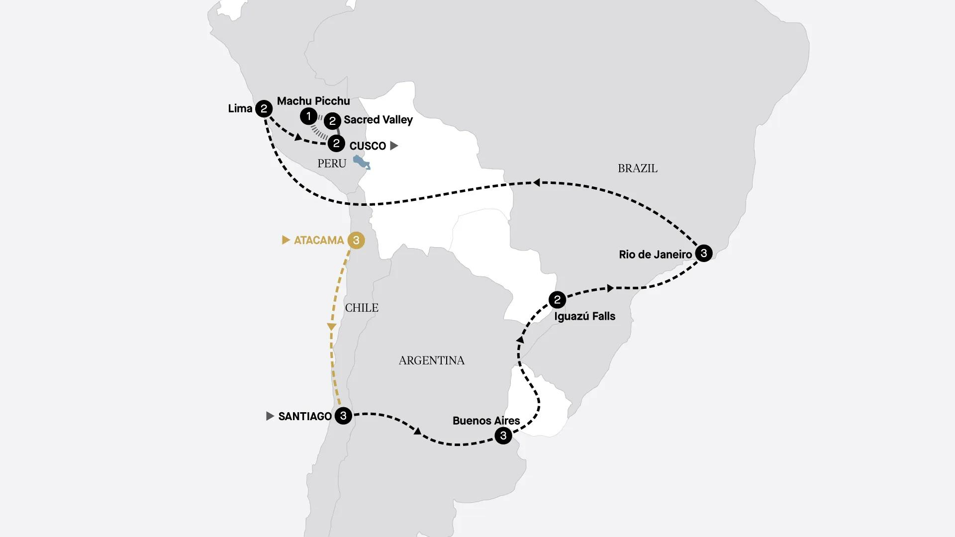 This journey dives into the heart and soul of Chile, Argentina, Brazil and Peru. Discover Iguazú Falls, the Sacred Valley and Machu Picchu’s inimitable mountain location. As well, discover the diverse South American cities of Santiago, Buenos Aires, Rio de Janeiro, Cusco and Lima.