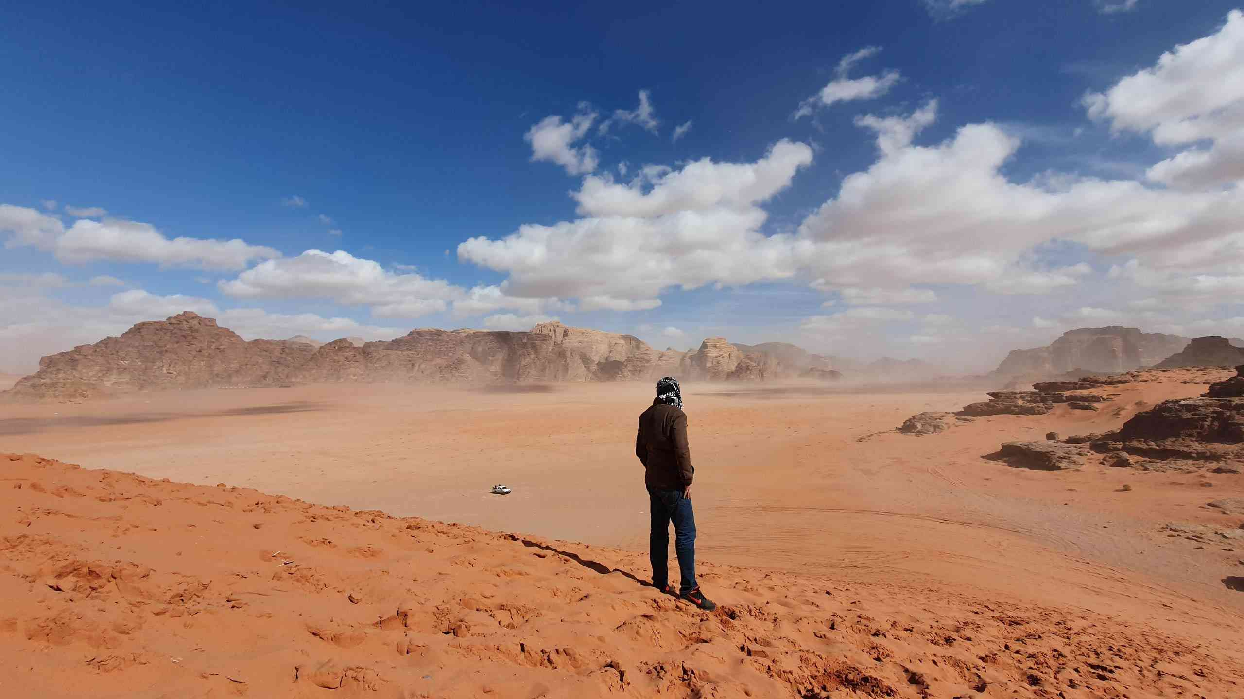 Today our eyes are set on travelling to the breathtaking Wadi Rum. This protected desert wilderness in southern Jordan spans over 700 kilometres-squared and is home to nomadic Bedouin tribes renowned for their warm hospitality. Traces of ancient civilisations exist in the many carved inscriptions found throughout the Wadi Rum area, from pictographs to Thamudic, Nabatean and Arabic texts. The most lasting monuments in Wadi Rum, however, are those carved by nature — the natural rock bridges, towering rose-coloured sand dunes and vast peaks.