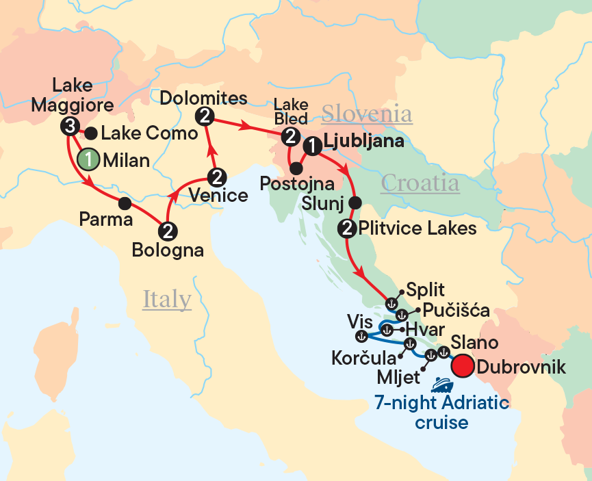 Our final stop is mesmerising Bellagio, hailed as the “Pearl of Lake Como.” Take in the incredible scenery along the way, including lovely hillside villas with the Alps as a backdrop, plus a guided introduction to this famous village’s storied past. With free time after, you could wander the narrow lanes, admire exotic blooms in the Villa Melzi gardens and snap Instagram-worthy photos at every turn. Perhaps grab a bite at a local trattoria, sipping regional wine while the world drifts by.