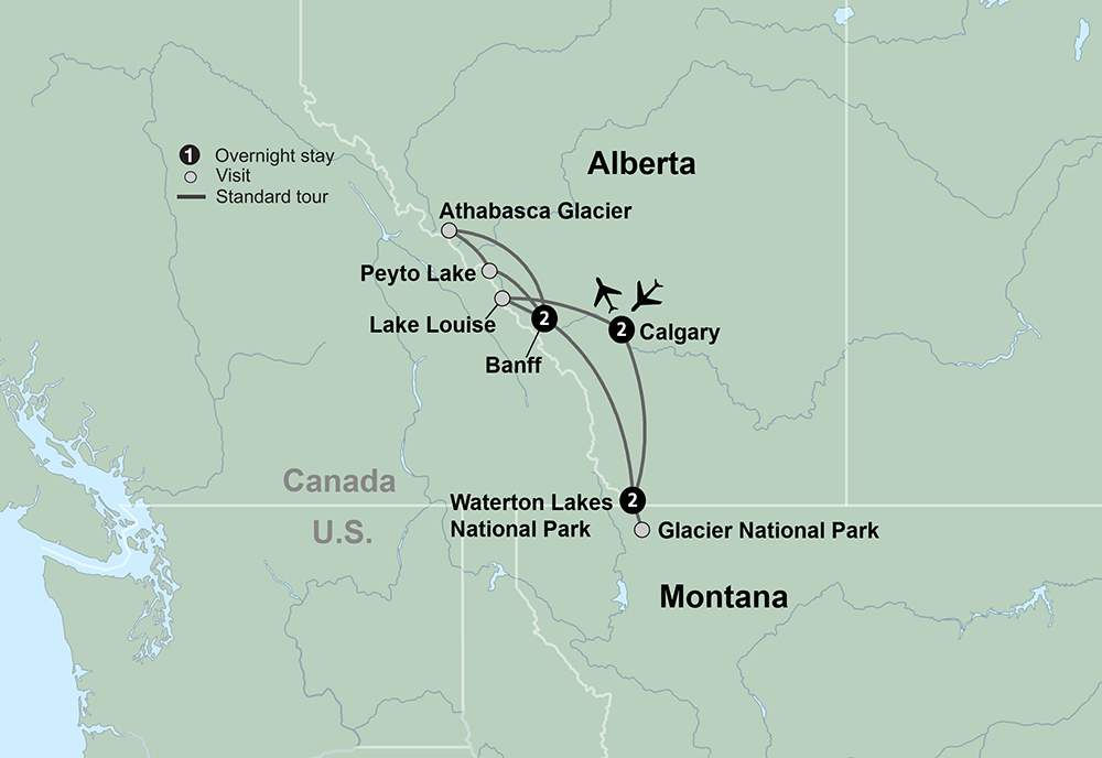 Ice fields, rushing waterfalls, glacial peaks, and towering summits are just a few of the wonders awaiting you in the Canadian Rockies and Glacier National Park. Visit Head-Smashed-In Buffalo Jump, a UNESCO World Heritage site and one of the world’s oldest, best preserved buffalo jumps. Ride aboard a Jammer (open-air touring car) during a visit to Glacier National Park. Journey along the unforgettable Icefields Parkway. Stop at Athabasca Glacier and choose to ride across this mass of glacial ice or take a walk on the glass-bottom platform at the Columbia Icefield Skywalk. Explore Bow Falls and Surprise Corner. Visit the incomparable Lake Louise. Get ready for an adventure that brings together the expanse of the prairies, the majesty of the Canadian Rockies, and Montana’s Glacier National Park.