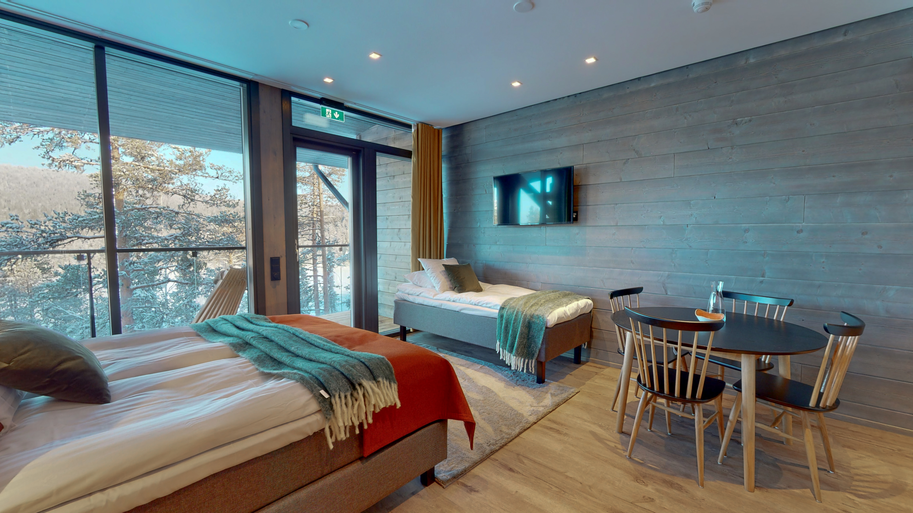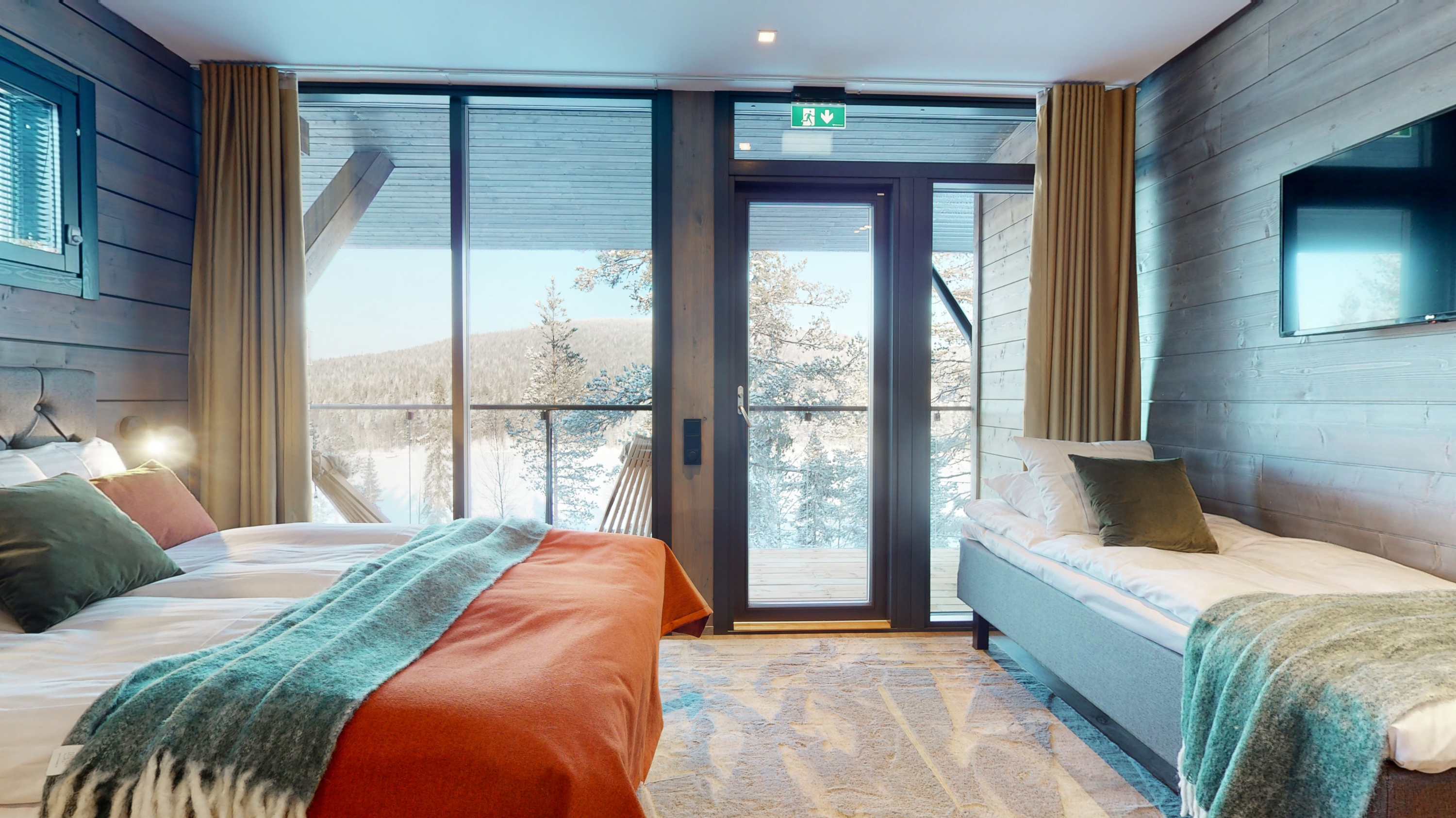 Kurula's Resort offers accommodation in spacious suites equipped with its own sauna, kitchen and deck. The suite is 40-42m2 in size and accommodates up to four people. Each suite has a deck or balcony with views to the lake and fells perfect for aurora watching. Rooms are equipped with queen size beds, fridge, hob, oven, microwave, lounge area, smart TV, Wifi, sauna, bathroom and drying cabinet.