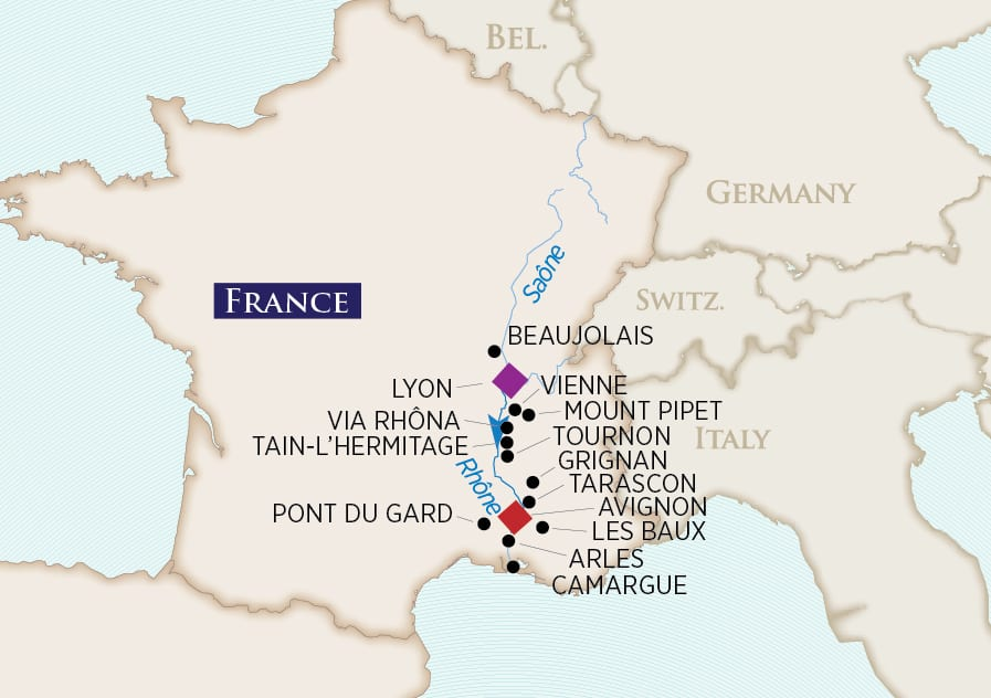 - Situated between the wine regions of Beaujolais and Côtes du Rhône lies Vienne with a Roman past that can be seen in its marvelously preserved ruins. Follow the footsteps of the ancient Romans on a walking tour to see the amazingly well-preserved Augustus and Livia Temple, the Saint Maurice Cathedral, a Gothic church that took more than 500 years to build, and St. Pierre Abbey—one of the oldest surviving churches in France, and now an Archaeological Museum. For those wishing to be more active, you can either take a guided bike tour along a portion of the ViaRhôna bike route or a guided hike from the ship to the Monastery at Mount Pipet. Later in the day travel to Lyon, considered the “Food Capital of France.” Take a walking tour that starts in Fourvière Hill, part of the city’s historic region that is now a designated UNESCO World Heritage Site and home to the 19th-century basilica Notre-Dame de Fourvière. Continue on to the old town of Lyon, followed by a guided walk through the St. Jean district, where you will be introduced to the city’s unique covered walkways, known as “traboules.” You can also visit the famous indoor market hall Les Halles de Lyon – Paul Bocuse, named after the late chef renowned for his Michelin-starred l’Auberge du Pont de Collonges restaurant. There you’ll have a chance to sample of the delicacies offered by butchers, bakers, chocolatiers and cheesemongers while taking in the colorful sights and enticing aromas around you. (B,L,D)