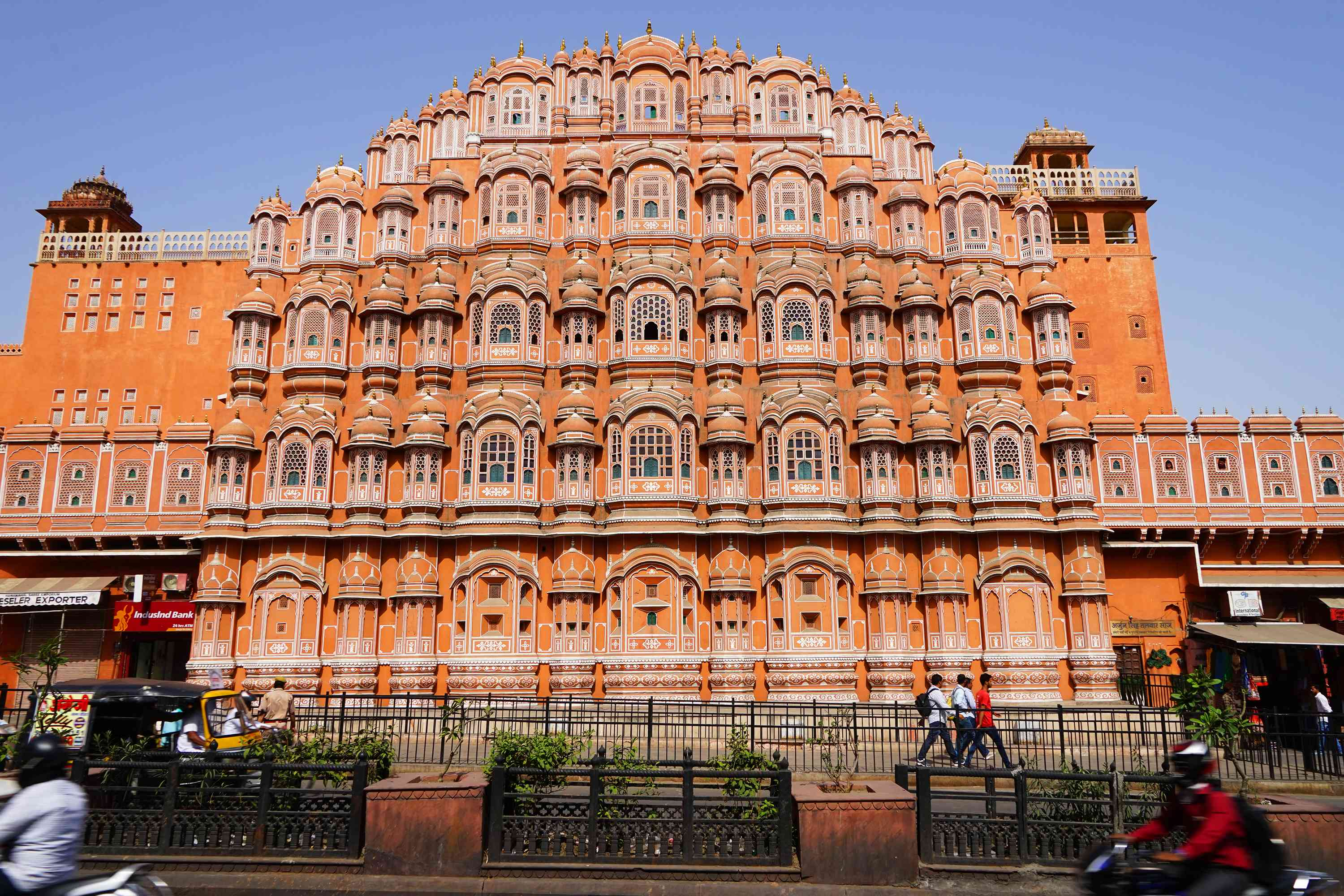 Our day is dedicated to seeing the sites of beautiful Jaipur. This morning we set off on a city tour, beginning with a photo stop at the iconic Hawa Mahal. The landmark is renowned for its unique and intricate architecture, offering a glimpse into the opulent lifestyle and cultural richness of Rajasthan's royal past. Referred to as the ‘Palace of Winds’, this stunning pink sandstone structure was built in 1799 and was designed for royal women to observe street life while remaining unseen.