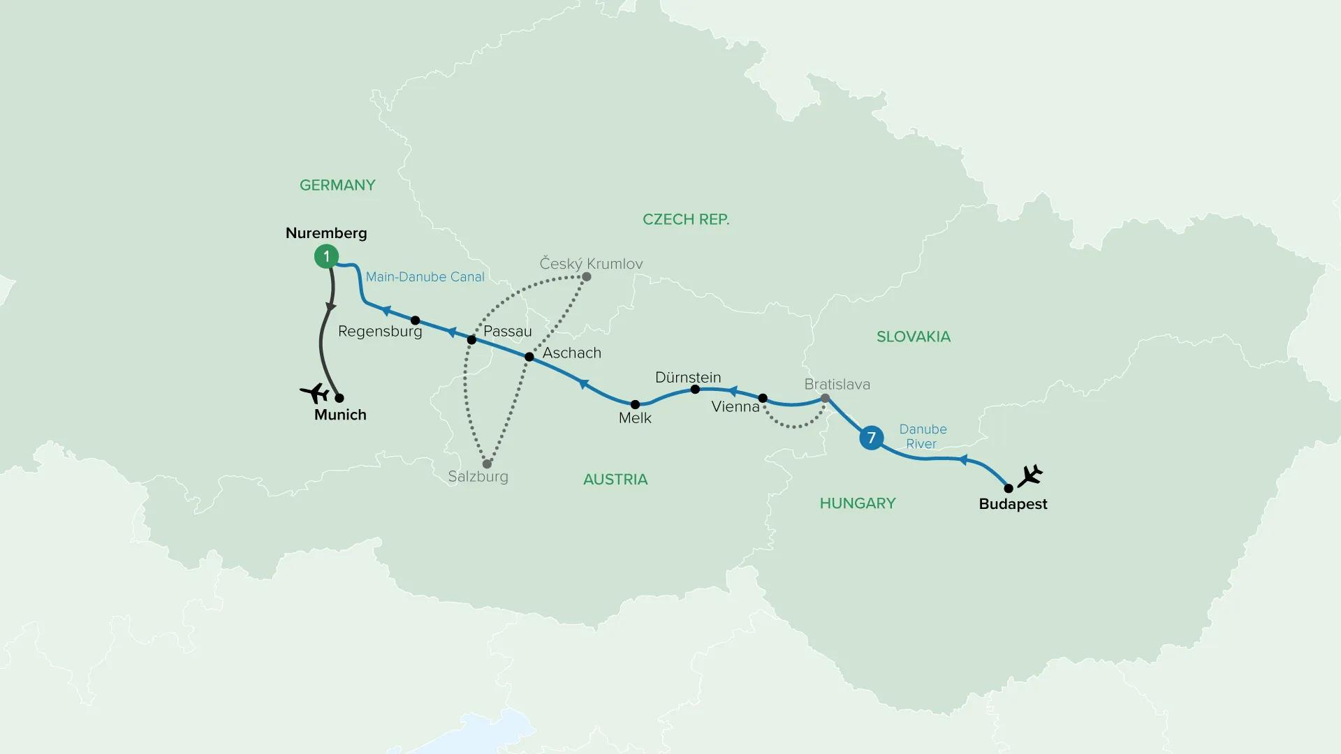 Begin in Budapest, Hungary’s grand capital, then head to charming Vienna, where elegance and art await. Continue to the medieval German cities of Regensburg and Passau, before ending your journey in the historic town of Nuremberg.