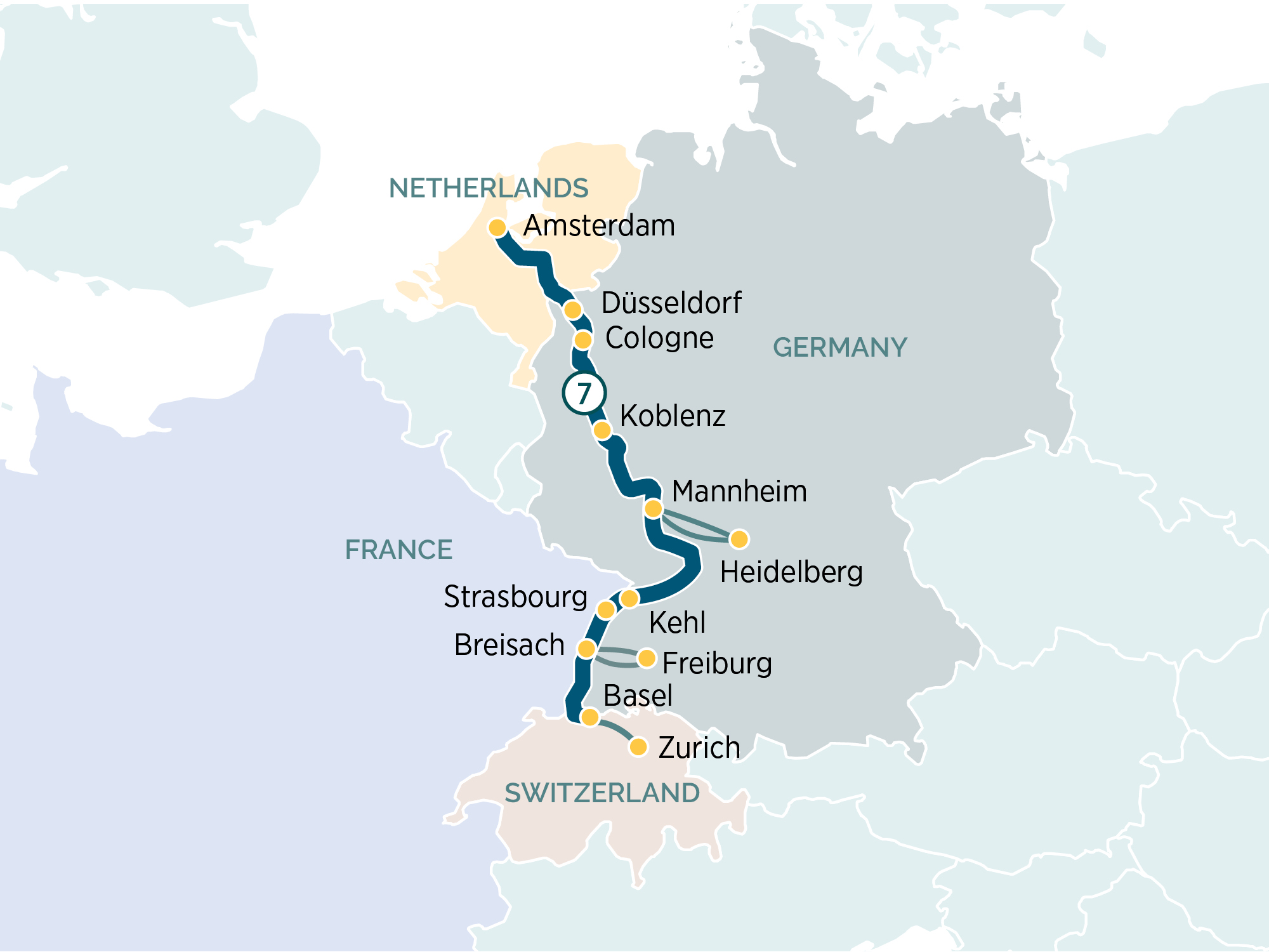 Explore the essence of the Netherlands, learning about the proud tradition of cheese-making and admire the quintessential sight of Dutch windmills dotting the picturesque countryside. Visit some of France and Germany’s oldest cities, from stylish Düsseldorf to resilient Cologne, resplendent with its magnificent Gothic cathedral, and ancient Koblenz, dating back to Roman times. Sample local delicacies in the Black Forest and visit the UNESCO City of Literature that has inspired the likes of Mark Twain. Relax on board while you marvel at the breathtaking landscapes of the World Heritage-listed Rhine Gorge, passing fairytale-like castles, steeply terraced vineyards and the legendary Lorelei Rock. Immersive experiences will take you to the famed spa town of Baden-Baden and through traditional German breweries.