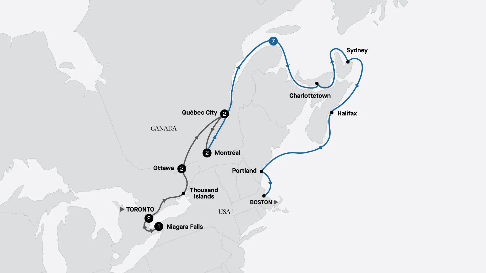 The wonders of Eastern Canada beckon. Discover cities shaped by glacial tides, marvel at one of the world’s most breathtaking waterfalls, and explore the Thousand Islands. After immersing yourself in Canada's iconic eastern provinces, set sail on a stunning cruise through the Maritimes and along the picturesque New England coast. Visit Portland in the USA before concluding your tour in Boston.