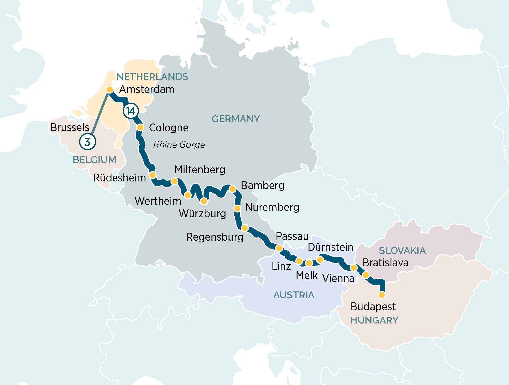 Journey through the heart of Europe on an unforgettable 15-day luxury cruise, tracing the timeless Rhine, Main and Danube rivers from Amsterdam to Budapest. Cruise through the continent’s celebrated highlights as you travel through the Netherlands, Germany, Austria, Slovakia and Hungary. Experience a vibrant tapestry of grand capitals and charming riverside towns, from the Gothic spires of Cologne to the esteemed wine villages of the Rhine, the elegant architecture of Vienna and the dramatic landscapes of the Wachau Valley.