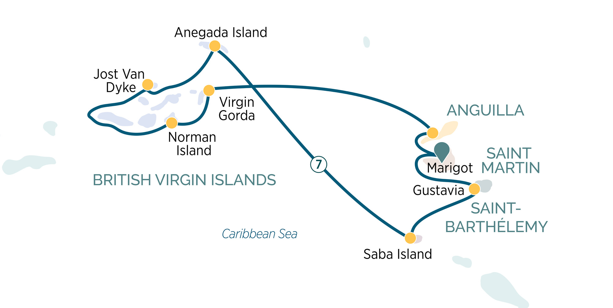 Embark on this 8-day Caribbean cruise starting from Marigot, Saint Martin, aboard an Emerald Cruises luxury yacht. Snorkel over vivid coral reefs in Anguilla or explore the series of grottoes on the beach at Virgin Gorda. Soak up the natural beauty of Norman Island and dip into the natural ‘jacuzzi’, a naturally formed sea pool. Experience the relaxed island atmosphere of Anegada, before sailing to Gustavia and concluding your cruise in Marigot.