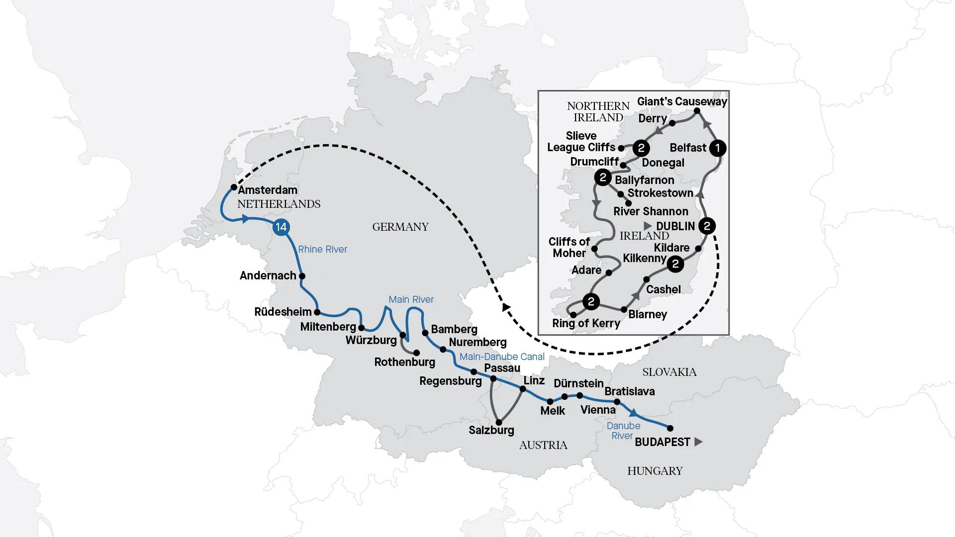 Explore Ireland's beauty on this small group tour with no more than 24 guests from the Giant’s Causeway to the Slieve League Cliffs. Explore the Titanic’s history and attend an exclusive Celtic music concert, among many other highlights. Then conclude your small group tour with a 14-night river cruise from Amsterdam to Budapest