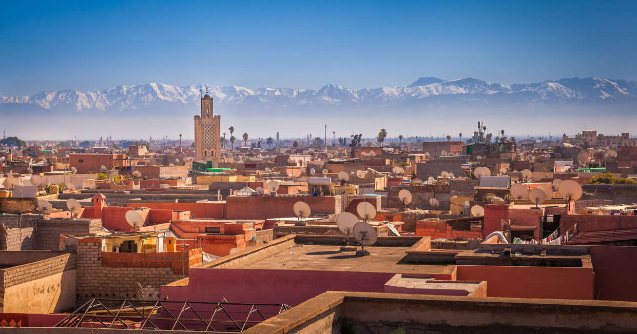 We'll transfer to Fes' central train station, the terminus for the train line to Marrakech. Travelling by train allows us to experience the widely contrasting landscapes of northern Morocco, from the rolling hills and fertile plains between Fes and Kenitra on the coast, passing through Meknes once more. As we get closer to the coast, the landscape gets more built up, as we continue through Morocco's commercial hubs with glimpses of the Atlantic. Reaching Casablanca, the train turns inland and travels through an arid zone towards Marrakech as the towering Atlas Mountains eventually come into view and we pull into the famous 'red city' of Marrakech.