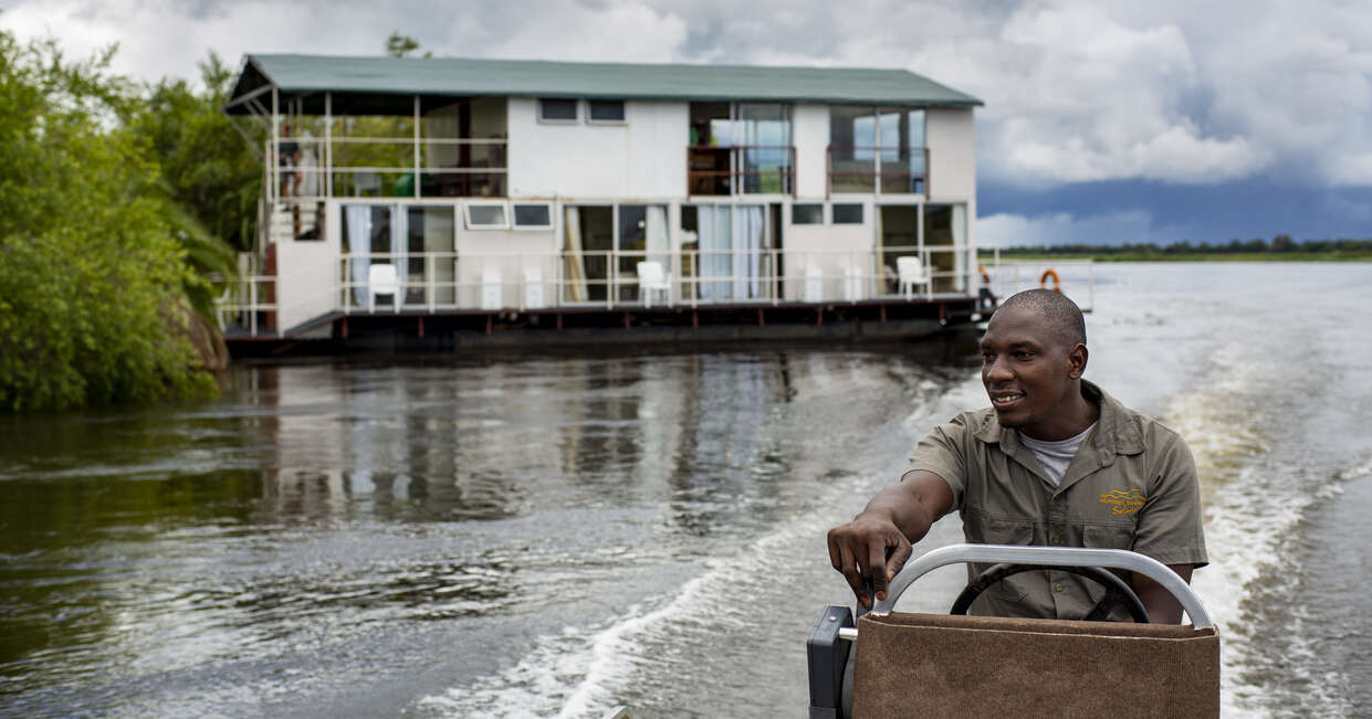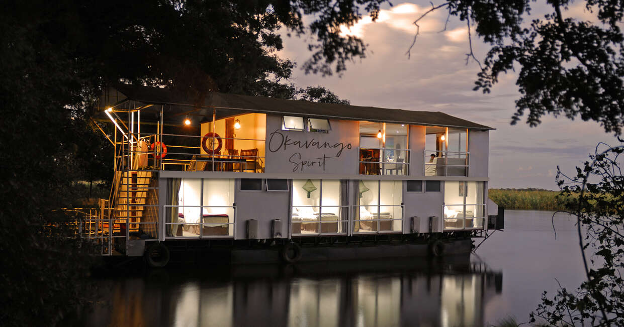 Departing after breakfast, we'll drive up the west side of the Okavango delta panhandle to Shakawe, where we'll leave our vehicle behind and board a motor launch to our houseboat. On arrival, we'll meet our friendly crew who will be our hosts for the next two nights. After settling in, lunch is served in the top-floor dining room, with panoramic windows offering a backdrop of the Okavango River basin.