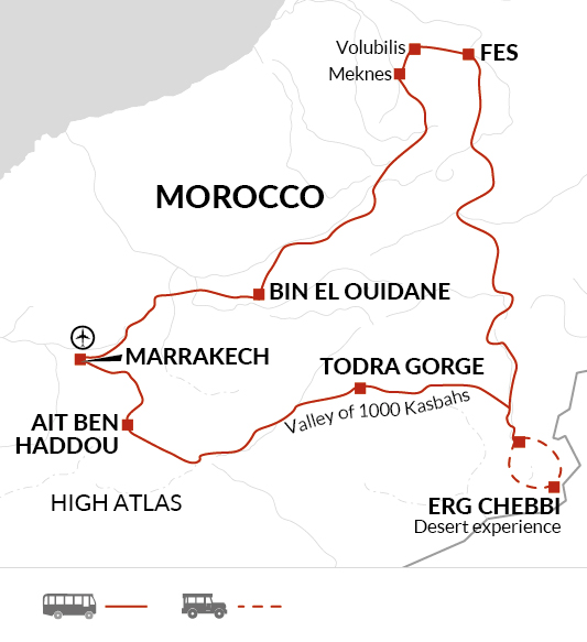 Note: This is a fast-paced tour with limited time in Marrakech, if you'd like more time to explore the city, there's the option to add additional nights onto the start or end of your trip.