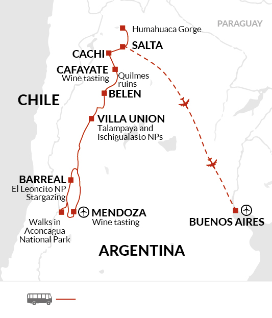 A full day exploring weird and wonderful landscapes awaits us as we delve into the moonlike scenery of Ischigualasto National Park, and the red rock towers of Talampaya. Once the kingdom of dinosaurs, these two parks contain the most complete fossil record known from the Triassic Period and have together been granted UNESCO heritage status.