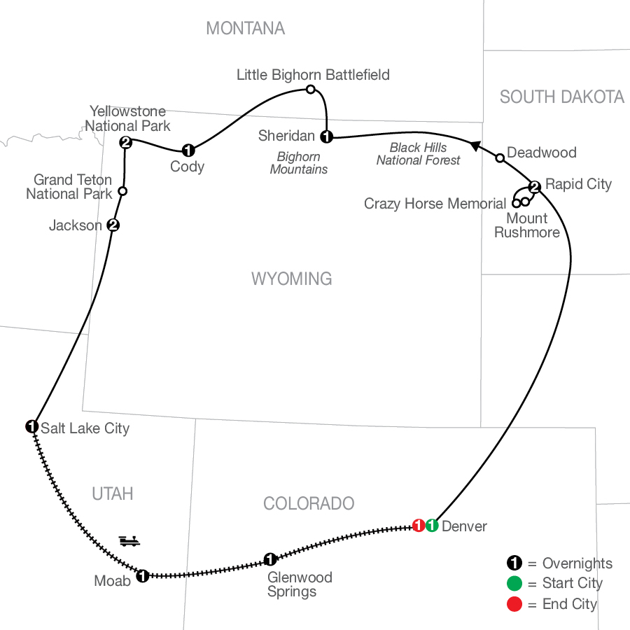 Special features included in this tour:• Visit to Mount Rushmore National Memorial and Crazy Horse Memorial • Orientation tour of Rapid City and guided sightseeing in Deadwood • Visit to Little Bighorn Battlefield National Monument • Globus Choice excursions in Cody – included in your tour with your choice of a guided trolley tour or visit to Buffalo Bill Center of the West • Guided sightseeing in Yellowstone National Park with visits to Mammoth Hot Springs, Fountain Paint Pot, Grand Canyon of Yellowstone, and Old Faithful • Guided visit to Grand Teton National Park and lakeside walk at Jenny Lake • Chuckwagon [LF] cookout dinner and Wild West show at Cache Creek Canyon • Guided sightseeing tour of Salt Lake City including historic monuments • Canyon Spirit rail journey experience from Denver to Salt Lake City, with overnight stays in Glenwood Springs and MoabEnjoy spectacular fall colors on our Fall Foliage departures: September 15-October 5 (Mother Nature permitting).
