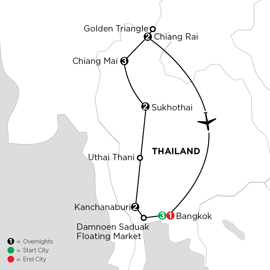 Discover a rich history, fascinating cultures, religious monuments, and much more on this fantastic tour of Thailand. In Bangkok—Thailand’s current capital—visit the Temple of the Golden Buddha; the Temple of the Reclining Buddha built in 1832; and the Grand Palace, the royal residence established in 1782 where you’ll see the Emerald Buddha, Thailand’s most sacred Buddhist sculpture. You’ll also cruise the city’s canals (klongs) by long tail boat. Travel to one of Thailand’s most beautiful provinces – Kanchanaburi. Take a long tail boat ride through vibrant Damnoen Saduak Floating market. Ride a train over the famous River Kwai Bridge, part of the infamous Death Railway built by prisoners during World War II. Visit Hellfire Pass Memorial, a walking trail and interpretive center detailing the life of the Allied prisoners and Asian workers who helped build the railway. In Sukhothai, Thailand’s 13th-century capital, visit Sukhothai Historic Park, a UNESCO World Heritage Site with ruins of palaces, temples, and homes. But that’s not all…in Chiang Mai explore a night market by tuk-tuk and visit an amazing elephant sanctuary to learn about the conservation efforts of orphaned and rescued elephants. Travel to the “Golden Triangle,” where Thailand, Laos, and Myanmar meet, and visit a local tea plantation. Your vacation in Thailand is rich in experiences, sights, and welcoming people you’ll long remember!