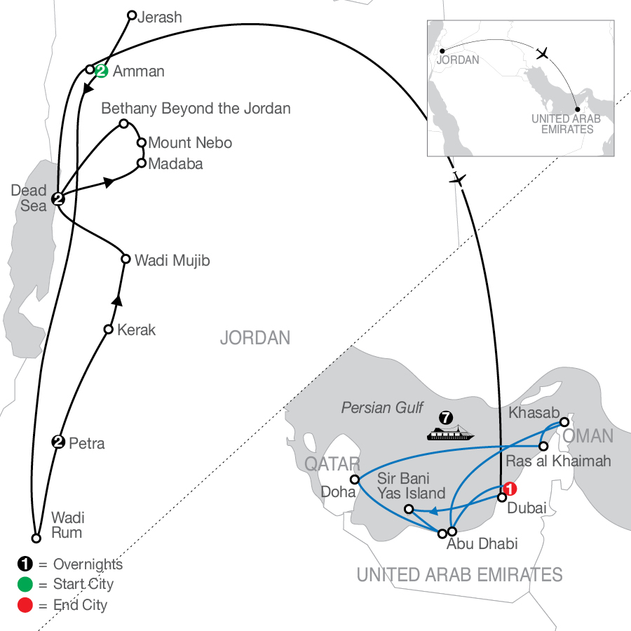 Today, bid good-bye to Jordan as you board your flight to Dubai, one of the U.A.E.’s most famous emirates. On arrival a Local Host will meet you and accompany you to the port for embarkation. (B)TOUR HIGHLIGHT REACH FOR THE SKY The drive to the port gives you the first taste of the U.A.E., a relatively young country built on a rich heritage, driven by grand aspirations, and thriving on a mosaic of cultures. Get your first glimpse of the glittering skyline, composed of opulent buildings that blend innovation and heritage. Keep your eye out for the Burj Khalifa, the world’s tallest building!