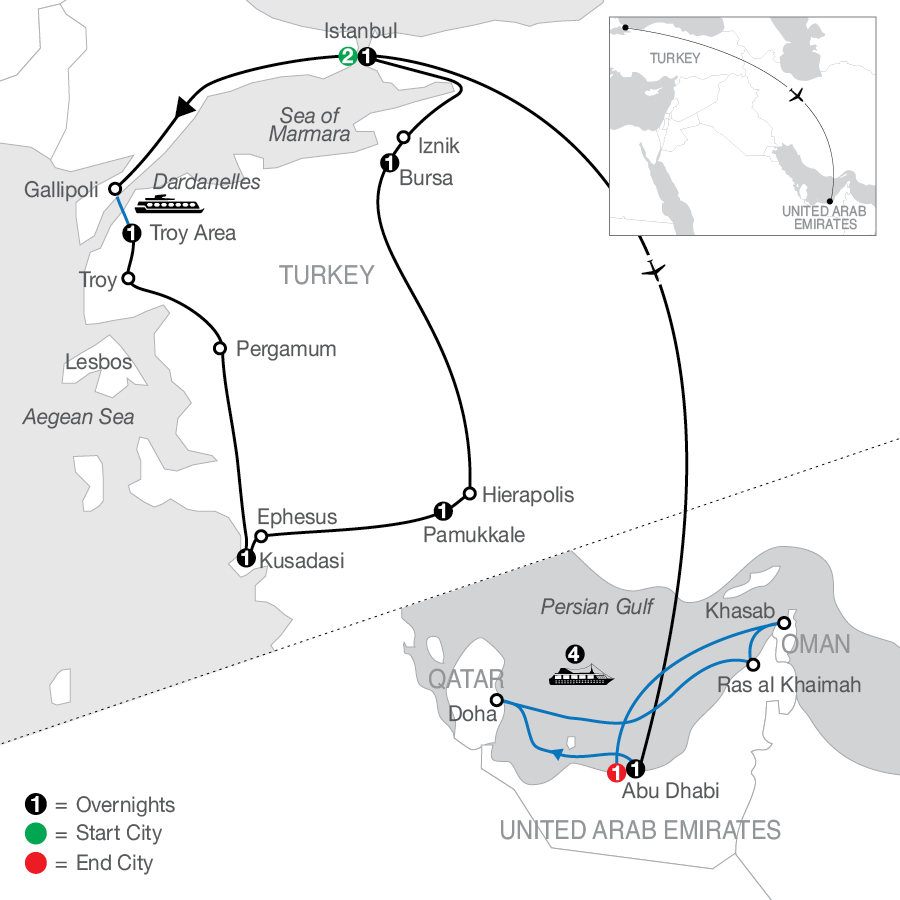 Special Features Included in this Tour:• Guided sightseeing of Istanbul’s highlights featuring visits to the Roman Hippodrome, Blue Mosque, Hagia Sophia, and Topkapi Palace • Visit to the Grand Bazaar in Istanbul with traditional Turkish coffee experience at a historical coffee roaster • Visit to the WWI battlefields on the Gallipoli peninsula, the Anzac Cemetery, and the Lone Pine Memorial • Guided sightseeing of the Troy archaeological site and see the symbolic wooden Trojan Horse • Guided visit to the Asklepion at Pergamon • Guided walk through the ancient ruins of Ephesus; see St. John’s Basilica.• Visit to the ancient city of Hieropolis at Pamukkale featuring views of the travertine terraces and thermal pools.• Visit to the Great Ottoman Mosque (Ulu Camii) of Bursa, plus the Historical Covered Bazaar, and the Silk Market with Kestane Sekeri tasting• 4-night Iconic Arabia Cruise aboard the Celestyal Discovery• Port days at leisure in Abu Dhabi, Doha, Ras al Khaimah, and Khasab• Flight from Istanbul to Abu Dhabi• Dardanelles crossing by ferry