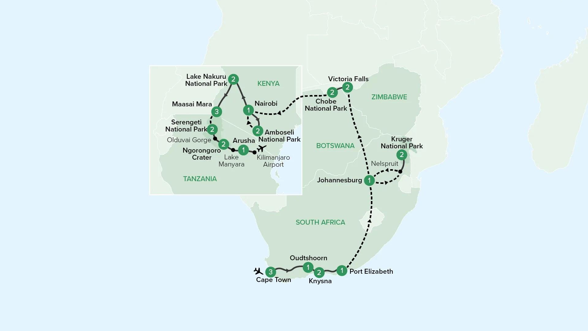 Embark on an incredible 28-day African adventure. Highlights of this tour include a two-night stay at Shishangeni Private Lodge, a visit to Victoria Falls, and an outdoor boma dinner under the stars. You'll also discover Africa's wondrous wilderness and enjoy enriching game drives in some of the continent's best national parks.