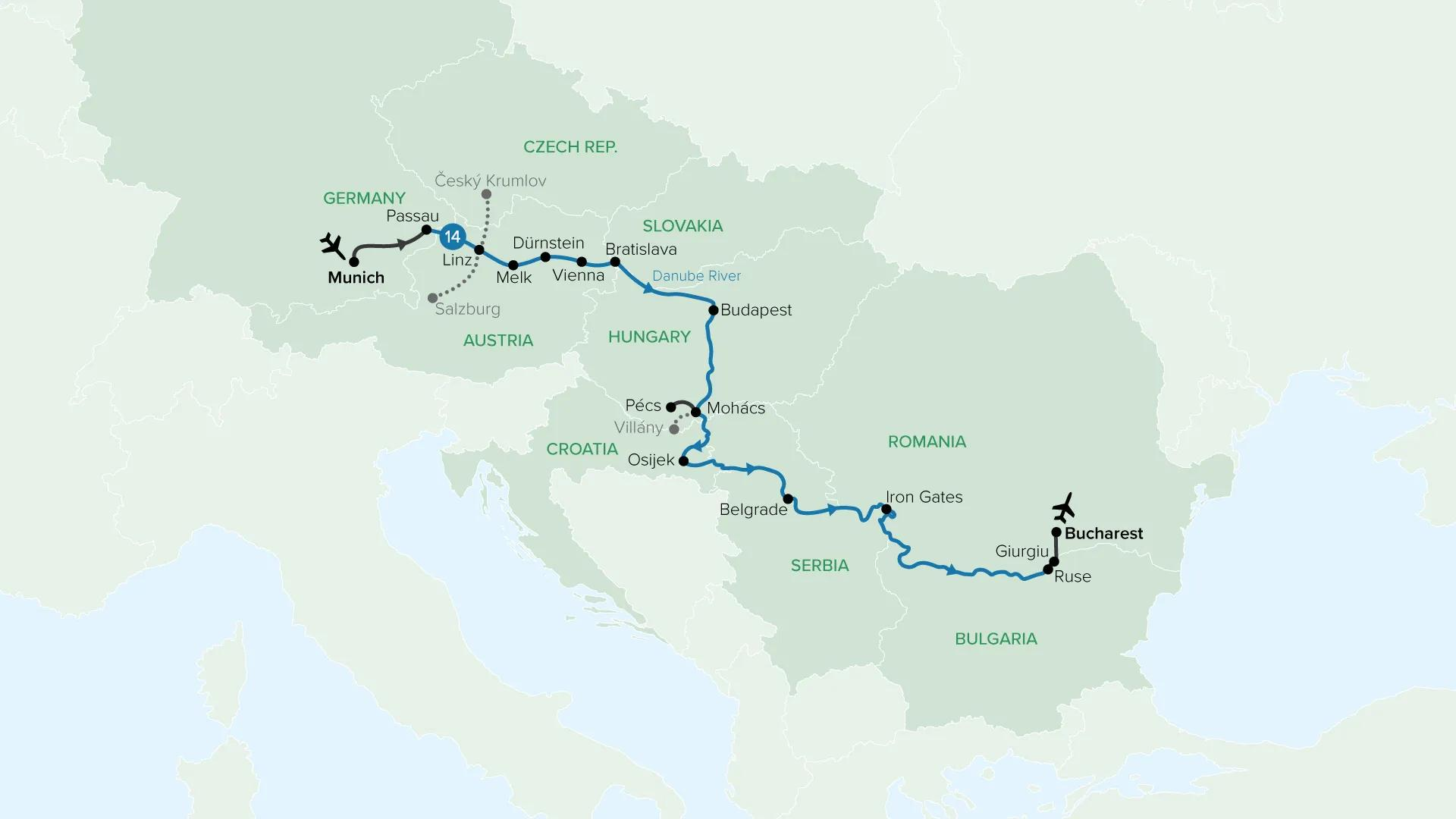 Spend fourteen nights cruising on a Travelmarvel river ship from Munich to Bucharest. Immerse yourself in Bavarian festivities and learn about life in Serbia with a visit to a local family’s village.