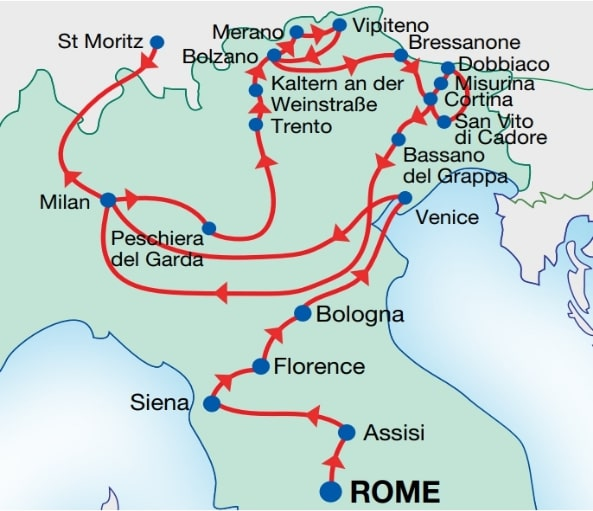 Embark on a 13-day journey through Italy's rich artistry and the enchanting Alps. Begin in Rome before journeying through Assisi, Siena, and Florence—where masterpieces and local flavors come alive. Drift through Bologna’s medieval charm, glide Venice’s canals, then board the Bernina Express for jaw-dropping alpine vistas. Explore Bolzano, Merano, and Lake Braies in the shadow of the Dolomites, unwind in Cortina d’Ampezzo, and end with a taste of grappa in Bassano del Grappa before cosmopolitan Milan. Every moment is packed with history, beauty, and delicious experiences.