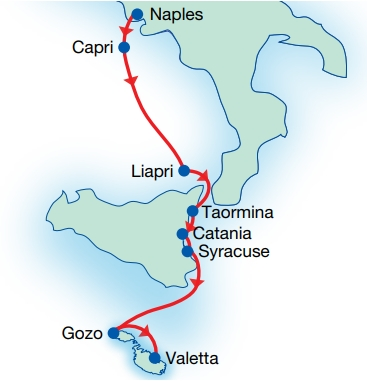Embark on an 8-day cruise from Naples to Malta aboard the M/Y Variety Voyager (36 Cabins). Begin in Naples before sailing to Capri and the Aeolian island of Lipari. Continue to Sicily to explore Taormina, Catania, and Syracuse, with optional tours including Mount Etna and key historic sites. The journey concludes in Malta, with time to visit Gozo and its ancient temples before disembarking in Valletta.