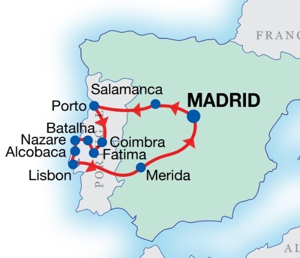 Join our regular multilingual coach tour (English and Spanish) for an unforgettable 6-day adventure through Spain and Portugal. Discover Madrid’s iconic landmarks, explore the historic charm of Porto, and visit UNESCO cities like Salamanca and Coimbra. Experience spiritual sites in Fátima and Batalha, enjoy Lisbon’s rich culture, and marvel at Roman ruins in Merida before returning to Madrid (accommodation in Madrid not included).