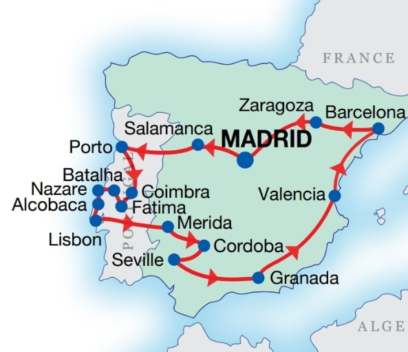 - Guided city tour with local guides in Madrid, Porto (including Douro Cruise & wine tasting) Lisbon, Cordoba (Mosque entrance included), Seville (Cathedral entrance included), Granada (Alhambra & Generalife Gardens entrance included), Valencia & Barcelona
