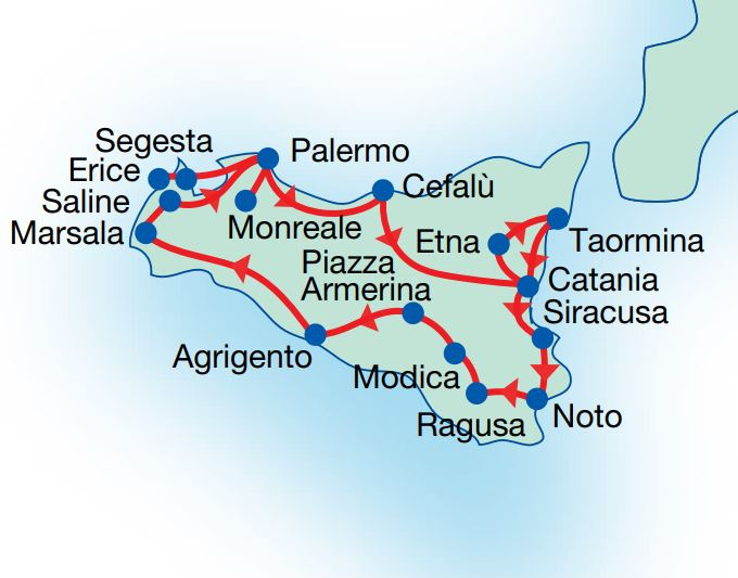 - Visits to Monreale, Palermo, Agrigento, Piazza Armerina, Ragusa, Siracusa, Noto, Etna, Taormina, Catania old town centre, Cefalù