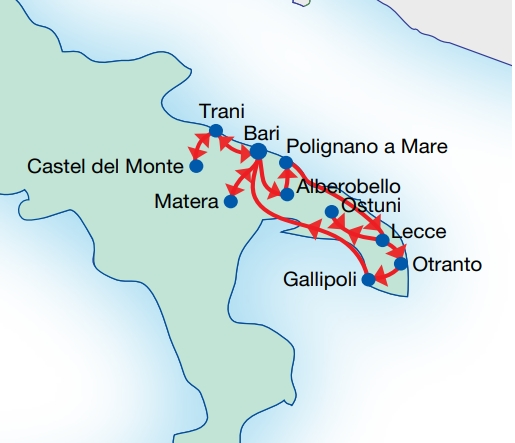 - Guided tours: Trani, Castel del Monte, Matera, Alberobello, Polignano a Mare, Ostuni, Lecce, Gallipoli, Otranto