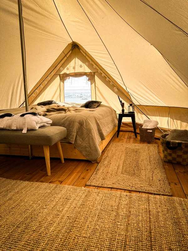 - 3 nights staying in a tented camp. Your tipi-like tent has ample space to stand inside and move around. It comes with 2 single beds or one double bed, fully lined - small table with chairs and an electric heater - and each tent has its own private toilet and hot shower.