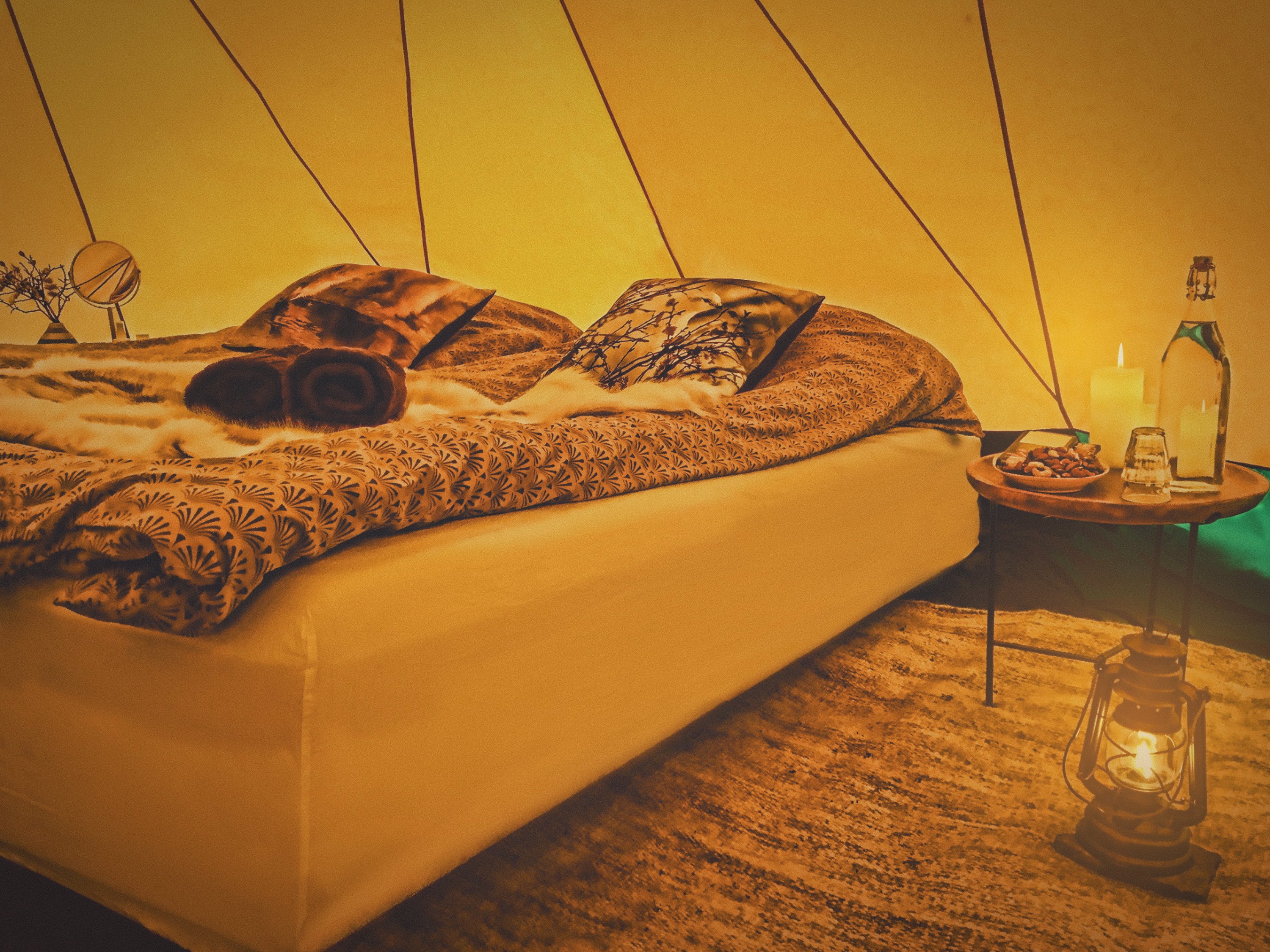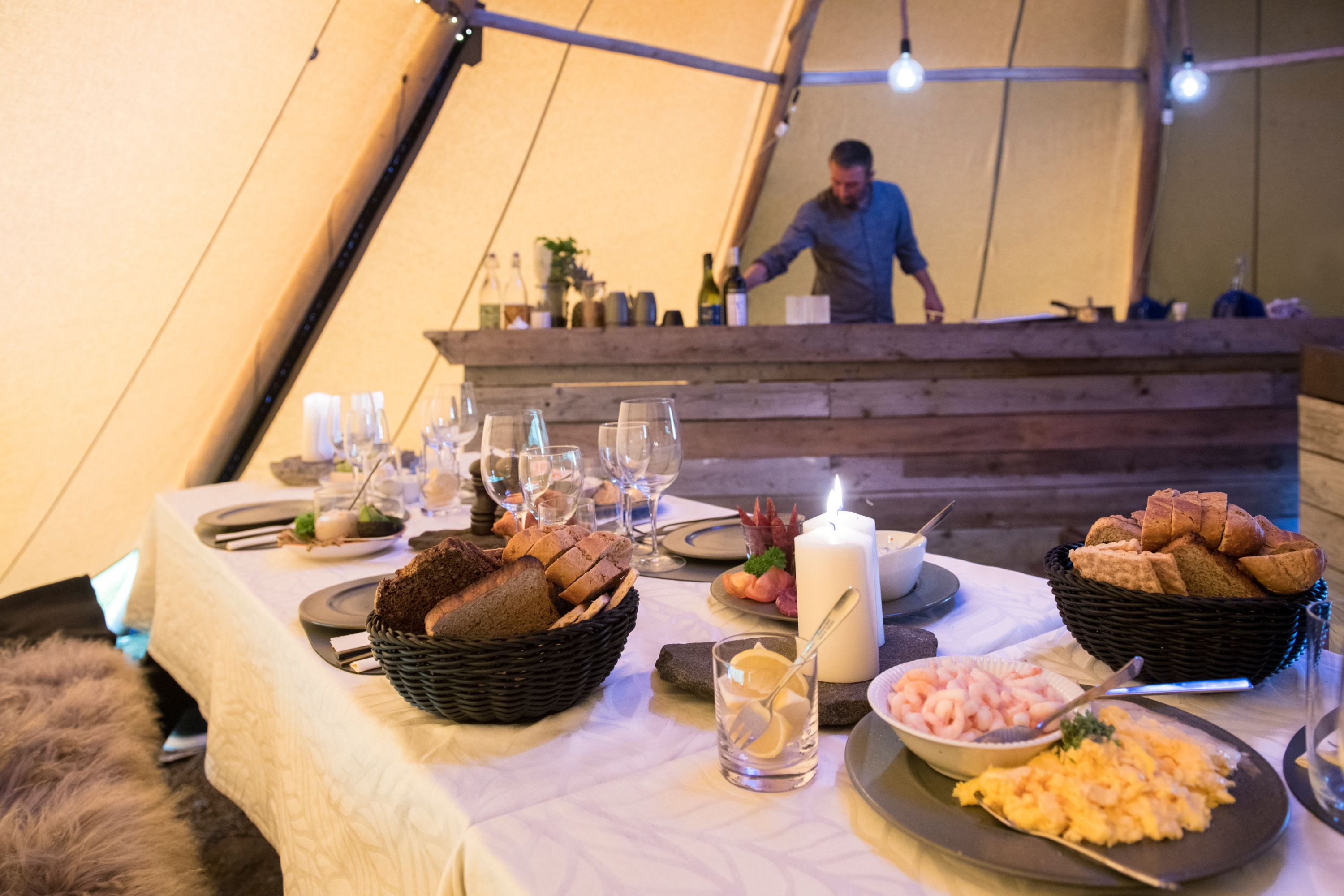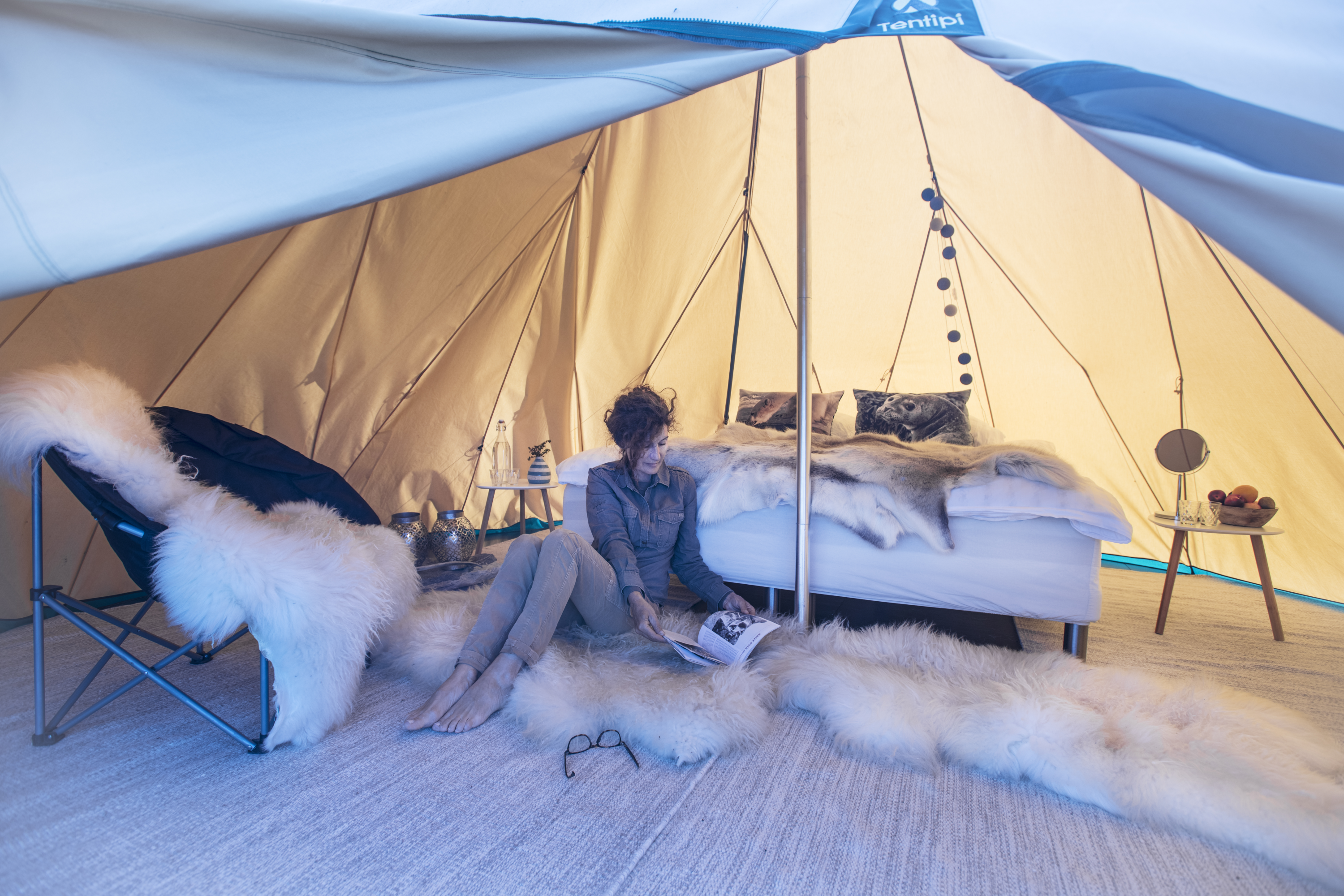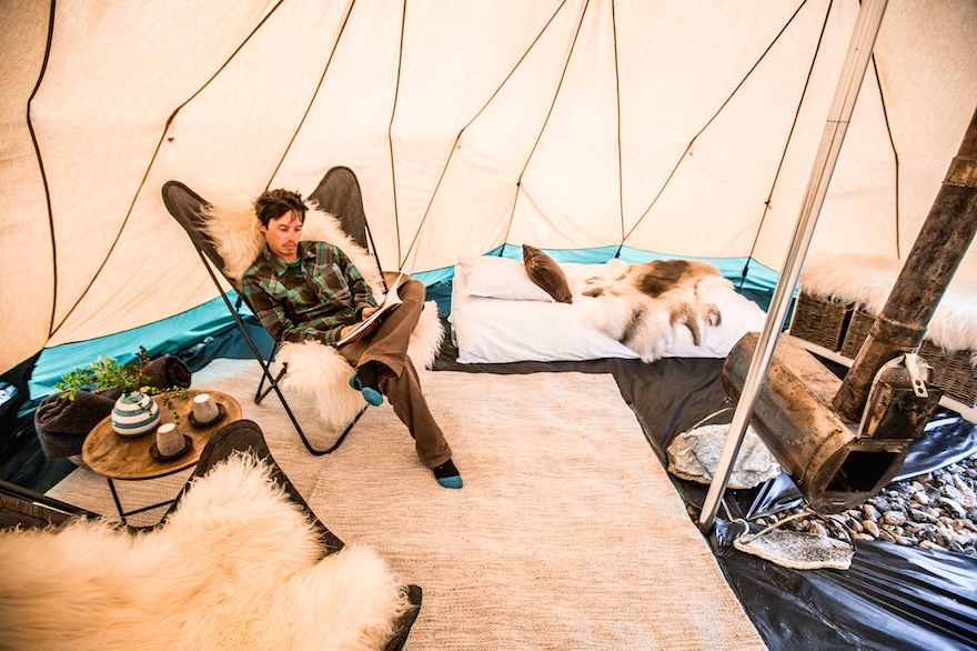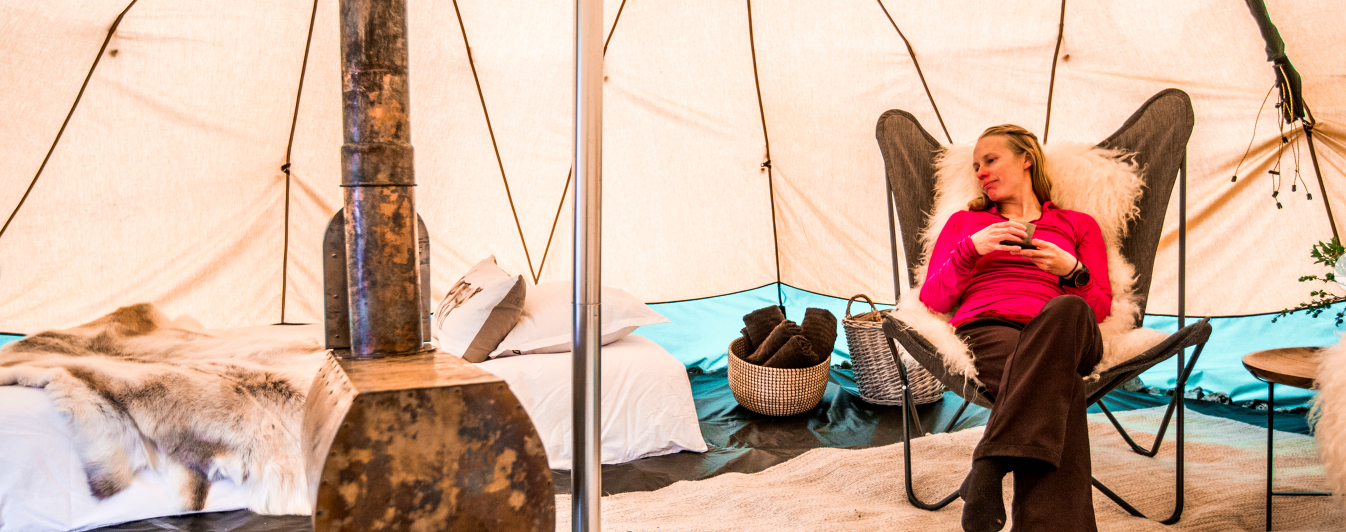 - 5 nights staying in a tented camp. Your tipi-like tent has ample space to stand inside and move around. It comes with 2 single beds or one double bed, fully lined - small table with chairs and a cozy stove - and each tent has its own private eco toilet and hot shower.