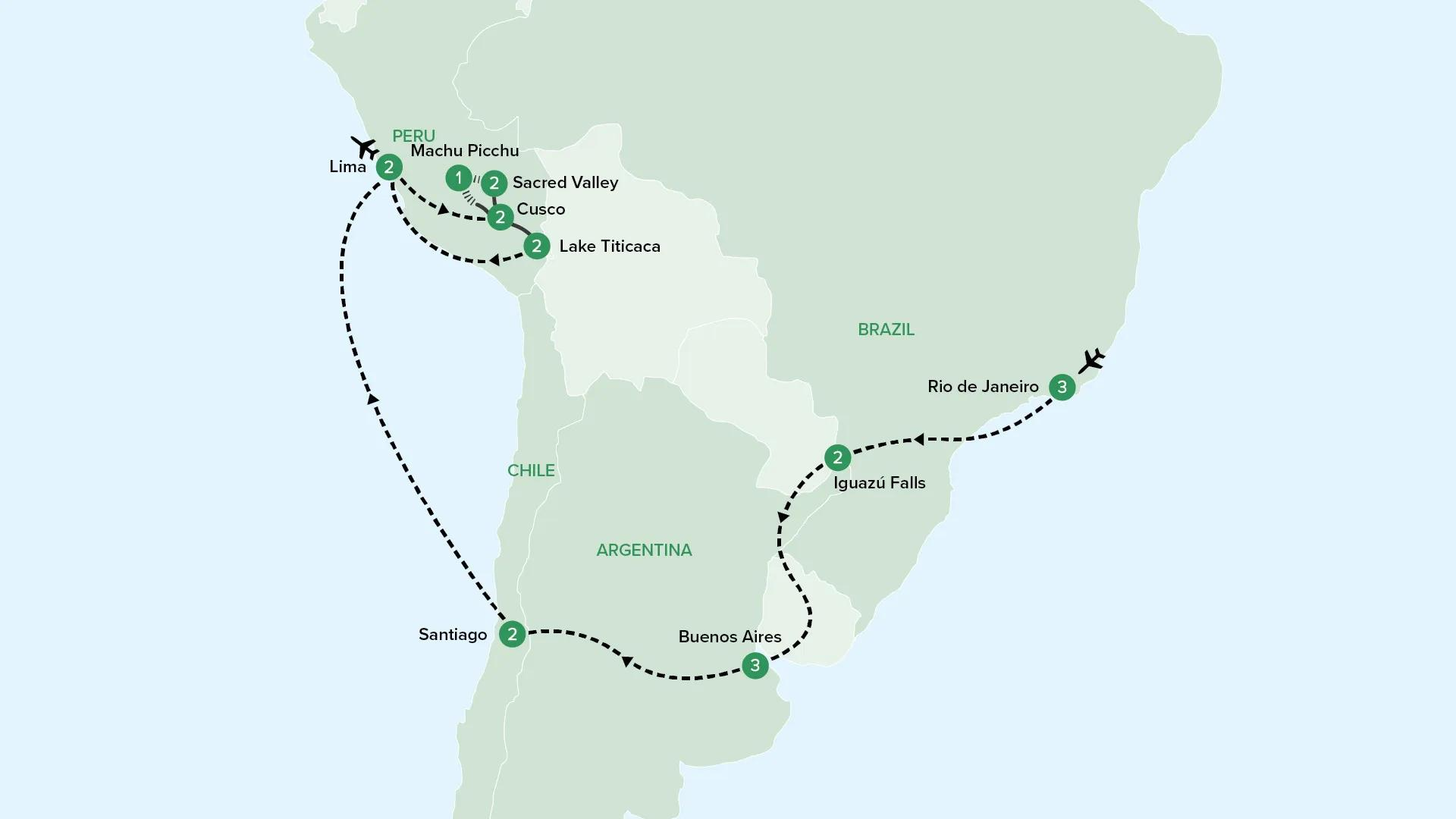 Discover four countries in 20 days on this incredible South American Small Group Tour with no more than 24 guests. Explore Chile's vibrant capital, Santiago. Immerse yourself in Argentine culture in Buenos Aires. Visit the awe-inspiring Iguazú Falls. Enjoy a Brazilian BBQ in Rio de Janeiro. And marvel at the wonder of Machu Picchu and the Sacred Valley in Peru.