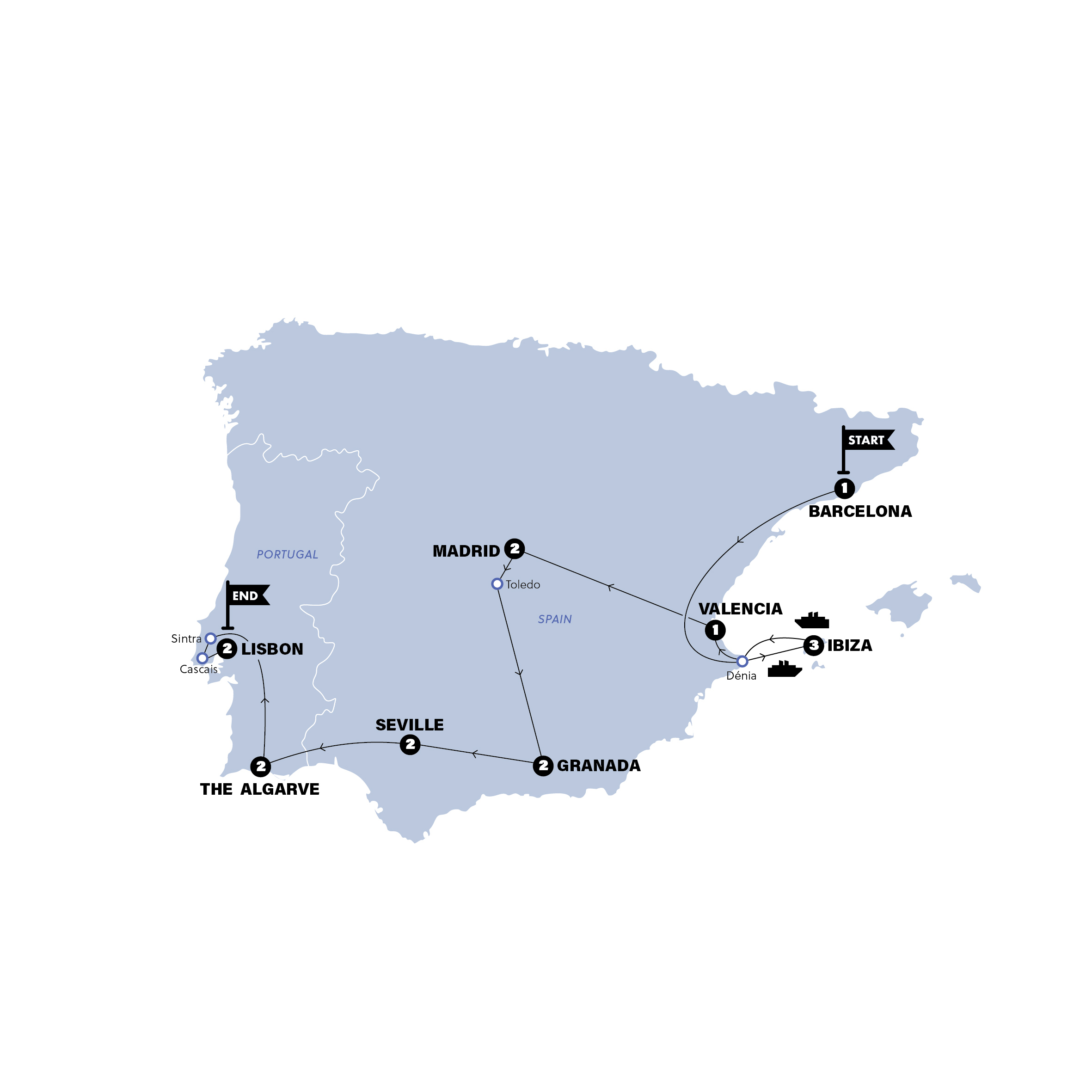 This epic 16-day Barcelona to Lisbon tour blends Spain’s most iconic cities with Portugal’s sun-soaked coast and culture. You’ll kick off in Barcelona, dive into Ibiza’s island energy, then roll through Valencia, Madrid, Granada and Seville before crossing into Portugal for Algarve beaches, fairytale Sintra and laid-back Lisbon. From big-name cities to coastal slow-downs, this stretch balances iconic sights with time to explore, connect, and soak up the best of the Iberian Peninsula at your own pace.