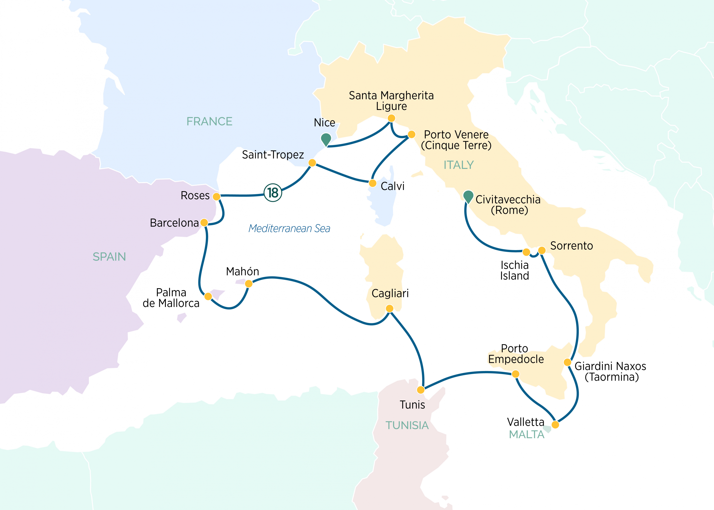 Cross into North Africa to explore the historic medinas of Tunis, then return to the Italian coastline to uncover the ancient wonders of Sicily. Visit Taormina, the cliffside jewel, and then the fabled coastal charm of Sorrento. In Ischia, unwind in natural thermal springs before heading to Valletta, Malta’s compact capital filled with rich history and Baroque architecture.