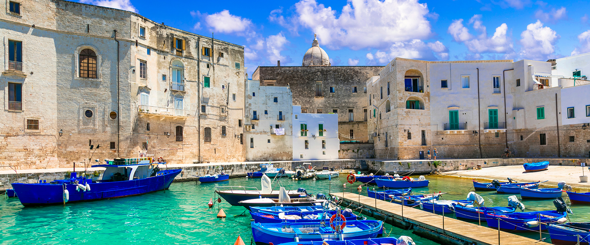 Italy’s coast is home to many charming towns, from historic and unhurried Monopoli in Puglia to the chic resort town of Taormina in Sicily. The renowned Amalfi Coast makes up the final stretch of this incredible journey, with its steep cliffside towns Amalfi and Sorrento oozing historic beauty on a stunning coastline.