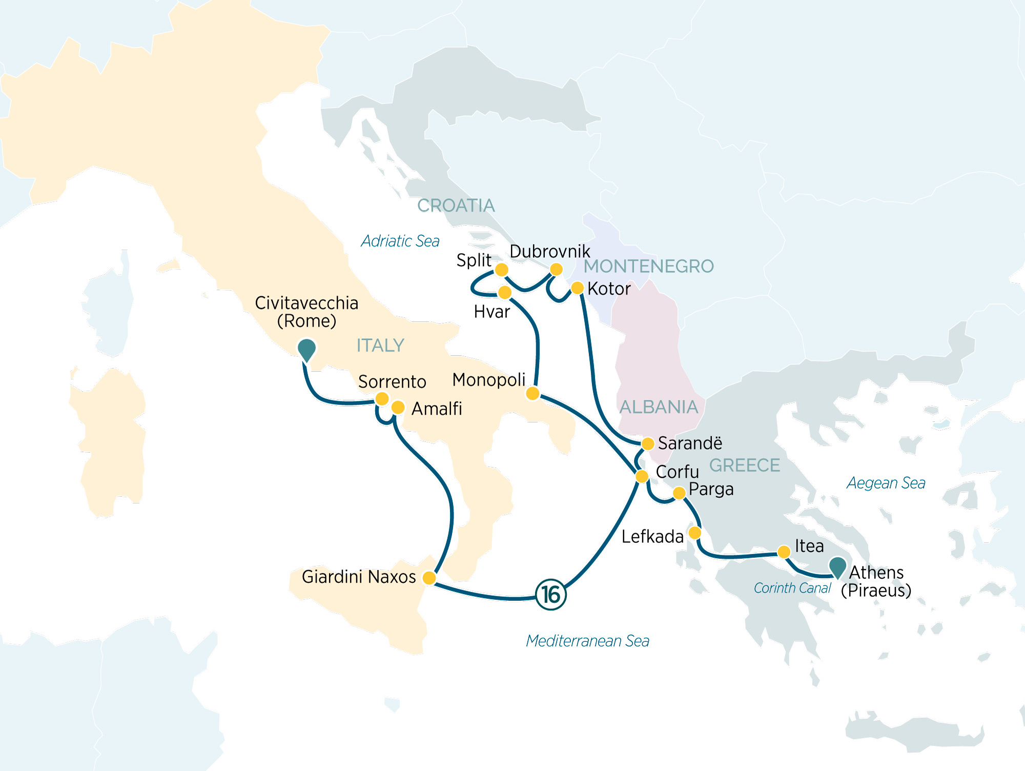 Embark on an unforgettable 17-day journey through some of the most stunning locales in the Mediterranean and the Adriatic, as you explore ancient civilisations, breathtaking landscapes, and vibrant cultures.