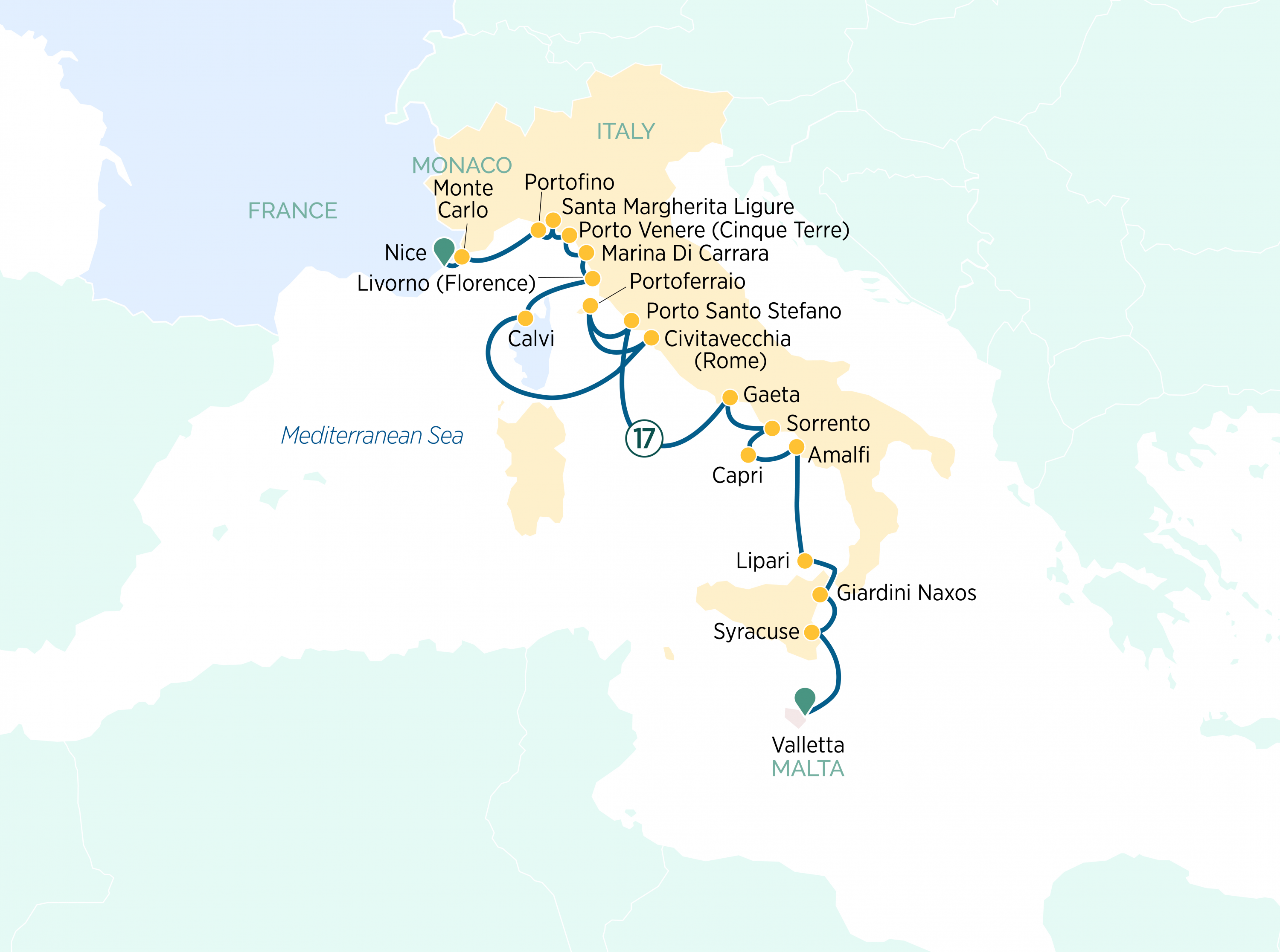 Start your memorable journey in Valletta, the World Heritage-listed capital of Malta, home to well-preserved Baroque-era architecture and grand fortifications. From here, on the Mediterranean's largest island, Sicily, and Giardini Naxos, explore archaeological sites dating back to ancient Greek and Roman times. Relax on the pristine beaches of Lipari, part of the incredible Aeolian archipelago and soak up storied history along the quaint streets of Amalfi. Be sure to sample the world-famous Limoncello liqueur in Sorrento, while taking in breathtaking views of the fabled Bay of Naples.